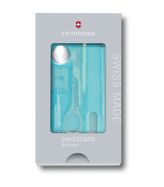 SWISS CARD NAILCARE (голубой) от Victorinox – швейцарский мультинабор в стильном формате кредитной карты на 13 функций, среди которых удобные ножницы и пилочка для ногтей. Популярная Швейцарская карта легко помещается даже в кошельке или любом кармане.Комплектация Swiss Card Nailcare, несмотря на позиционирование как дорожный набор для ухода за ногтями, позаботится о вашем комфорте вне дома, на работе, в поездке. Ваш компактный ремкомплект, чтобы отремонтировать или обрезать торчащие нитки, записать важную информацию или заполнить документы - вы готовы ко всему. Благодаря продуманному, отмеченному наградами дизайну и невероятной функциональности вы будете получать удовольствие каждый раз, когда вам понадобится воспользоваться каким-либо из инструментов.Информация о SwissCard Nailcare (0.7240.T21)✔ Количество функций: 13.✔ Голубой полупрозрачный корпус-органайзер из ударопрочного пластика.✔ Инструменты из первоклассной нержавеющей стали.✔ Размер карты (Д х Ш х Т): 82 х 55 х 4 мм✔ Вес набора: 26 г✔ Сделано в Швейцарии.✔ Упаковка: подарочная картонная коробочка.1. ножницы2. стеклянная пилочка для ногтей3. шариковая ручка4. пинцет5. увеличительное стекло6. булавка7. линейка в см8. линейка в дюймах9. зубочистка10-13. инструмент Quattro:- плоская отвертка 3 мм- плоская отвертка 5 мм- крестовая отвертка 00-0- крестовая отвертка 1/2