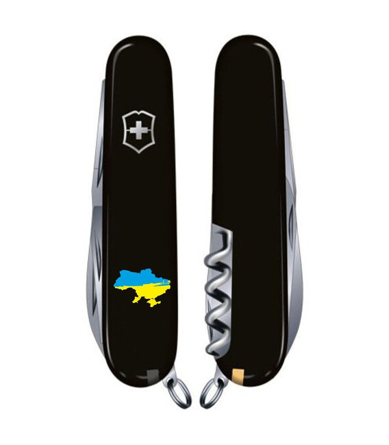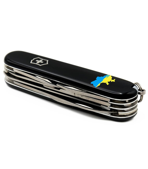 Средний карманный нож Victorinox HUNTSMAN UKRAINE 91мм / 15 функций / черные накладки / штопор / ножницы / пила по дереву / крюк / Карта Украины