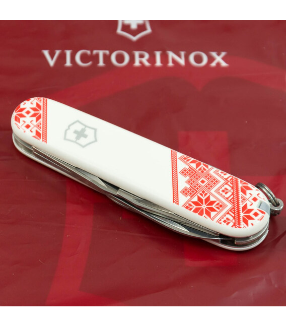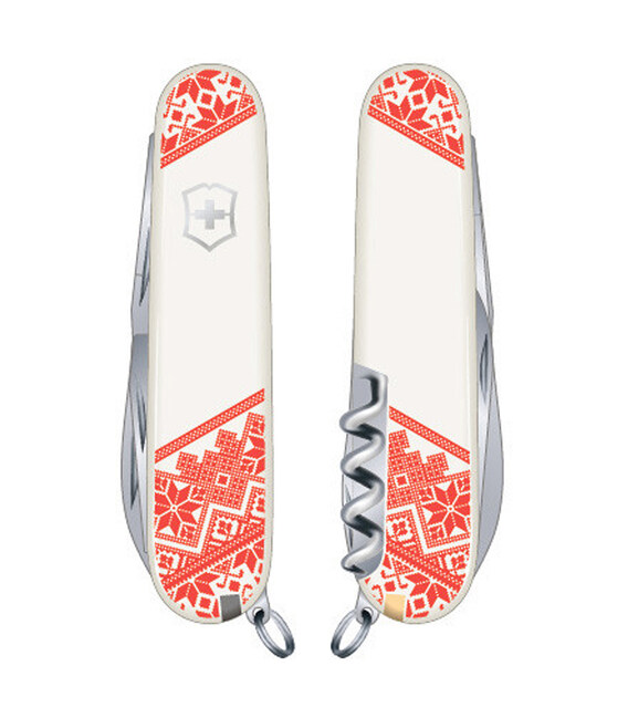 Средний швейцарский армейский нож Victorinox HUNTSMAN UKRAINE 91мм / 15 функций / белые накладки с красным орнаментом / штопор / ножницы / пила / крюк / Вышиванка Швейцария