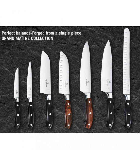 Victorinox Grand Maitre Wood Santoku - нож Сантоку с кованым рифленым лезвием 17 см и элегантной деревянной рукоятью. Сочетая японский стиль и швейцарскую функциональность, нож Grand Maître Santoku из серии кованых ножей Victorinox имеет цельное с хвостовиком лезвие, равномерно закаленное и идеально сбалансированное. Любая работа на кухне будет гореть у вас в руках, а рифленое лезвие еще больше расширит функциональные возможности, минимизируя прилипание продуктов к ножу. Идеально подходит для домашней кухни и позволяет легко нарезать мясо, рыбу, фрукты и овощи.Информация о ноже Victorinox GRAND MAITRE Wood Santoku 7.7320.17G✔ Коллекция высококлассных кованых ножей Grand Maitre.✔ Многозадачный нож для нарезки ломтиками, нарезки кубиками и измельчения.✔ Кованое лезвие 17 см с двусторонней заточкой.✔ Нож Сантоку с рифленым лезвием.✔ Рукоять из модифицированного клена с заклепками из нержавеющей стали.✔ Поставляется в подарочной коробке.✔ Нож не рекомендовано мыть в посудомоечной машине.