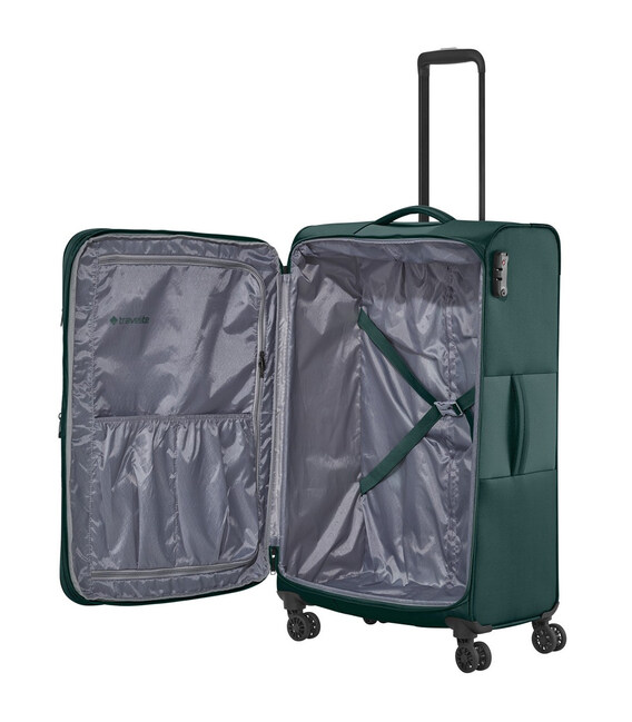 Travelite CROATIA [темно-зеленый] на 90-96 литров – большой чемодан с возможностью расширения, большим передним карманом и встроенным замком TSA. Размер L и мягкий тип корпуса – лучшее решение для длительных и дальних путешествий, поездок всей семьей, когда нужно взять с собой большое количество вещей.Коллекция Croatia от немецкого бренда Travelite – это линейка текстильных чемоданов в практичном мягком корпусе, который позволяет упаковать еще парочку-вторую вещей, когда твердый багаж уже трещал бы по швам, а в случае с размером L exp. дополнительное место дарит еще и вставка-расширитель на молнии. Внешний карман является еще одним преимуществом мягкого багажа. Он незаменим для размещения вещей первой необходимости: от билетов, документов или салфеток до книги или легкой куртки.Информация о чемодане Travelite CROATIA Forest Green [080349 82]✔ Водонепроницаемый текстильный корпус: полиэстер 600D.✔ Большой размер (+ расширение на 4 см): высота 77 – ширина 47 – толщина 30-34 см.✔ Масштабируемый объем с 90 до 96 литров.✔ Легкий вес: 3,3 кг.✔ Выносливая багажная молния с двумя бегунками.✔ Встроенный в корпус кодовый замок TSA LOCK®.✔ 4 колеса с двойными роликами – устойчивость и легкое разворачивание чемодана на одном месте.✔ Регулируемая по высоте телескопическая ручка.✔ Верхняя и боковая усиленные ручки для переноски.• Глубокая камера с фиксирующими ремнями.• Внутренне отделение на молнии под крышкой чемодана.• Дополнительные карманы на перегородке для мелкого багажа.• Большой передний карман на молнии.Оригинальные немецкие чемоданы TRAVELITE/Тревелайт - официальная гарантия качества и быстрая доставка от А ttribute.ua.
