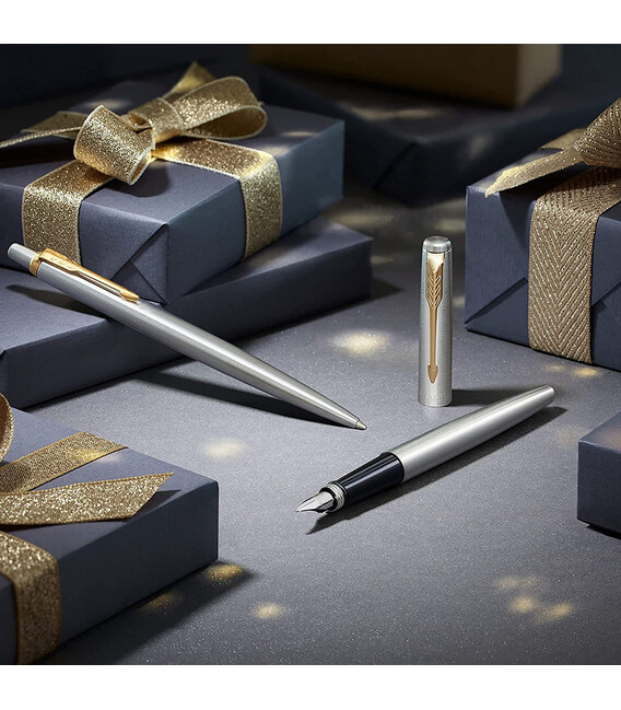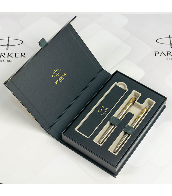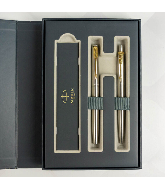 Подарочный набор Parker JOTTER Stainless Steel GT FP+BP DUO24 из перьевой и шариковой ручки. Дизайн станет актуальным для человека, который часто пишет, а выгодная цена делает набор привлекательным в качестве подарка людям разных возрастов.Коллекция JOTTER одна из самых популярных среди ассортимента Parker. Выпущенная впервые еще в 1954 году, линейка и сегодня остается востребованной благодаря компактности, долговечности, нестареющему стилю и высокому качеству.✔ Перьевая ручка JOTTER Stainless Steel GT Корпус и колпачок из полированной нержавеющей стали.Детализация PVD-позолотой.Перо из нержавеющей стали.Зона захвата из черного глянцевого пластика.В комплектации - один чернильный картридж.Длина ручки - 127-139 мм (с закрытым колпачком и на торце).Толщина корпуса - 10 мм.Ручка-перо имеет картриджно-конвертерную систему, поэтому работает как с картриджами для перьевых ручек, так и с конвертером и чернилами (чернила и конвертер продаются отдельно).✔ Шариковая ручка JOTTER Stainless Steel GT Корпус из полированной нержавеющей стали.Детализация PVD-позолотой.Классический механизм-кнопка с приятным звучанием щелчка.В комплектации - один шариковый стержень QuinkFlow.Длина ручки - 128 мм.Использует стержень QuinkFlow для шариковой ручки, который гарантирует плавный поток чернил и равномерно насыщенную линию. Ручка пишет мягко, а чернила не размазываются. Запас чернил рассчитан на линию примерно 3,5 км.Набор ручек Parker в подарочной коробке с гарантией качества.
