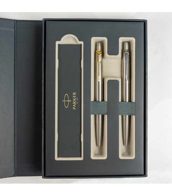 Parker JOTTER Stainless Steel GT BP + JOTTER Stainless Steel CT BP DUO24 – подарочный набор с двумя шариковыми ручками в стальном дизайне с отделкой позолотой и хромированием. Обе ручки представлены в коллекции Jotter, которая является подлинной иконой дизайна с 1954 года. Идеальная ручка для каждодневного письма и всех, кто много и часто пишет: от учащихся до профессионалов. Набор станет запоминающимся подарком по любому поводу: успехи в учебе или работе, на Рождество, Новый год или День рождения.✔ Шариковая ручка JOTTER Stainless Steel GT Корпус из полированной нержавеющей стали.Детализация: PVD позолота.Классический нажимной механизм с кнопкой.В комплектации - один шариковый стержень QuinkFlow.Длина ручки около 128 мм.✔ Шариковая ручка JOTTER Stainless Steel CT Полностью стальной корпус с полированной отделкой.Детализация: хромирование.Классический нажимной механизм-кнопка.В комплектации - один шариковый стержень QuinkFlow.Длина ручки около 128 мм.Шариковые ручки Parker гарантируют плавный поток чернил и равномерно насыщенную линию. Пишут мягко, а чернила не размазываются. Запас чернил в стержне рассчитан на линию примерно 3,5 км.Набор ручек поставляется в подарочной коробке с гарантией качества.
