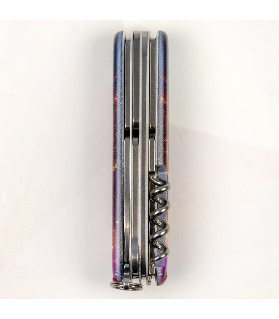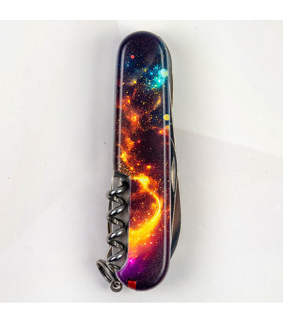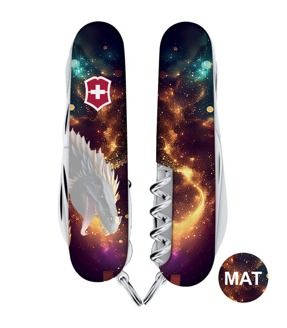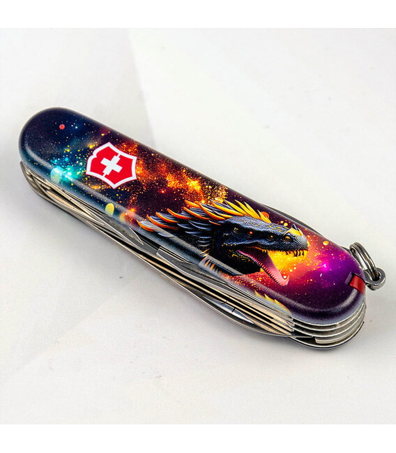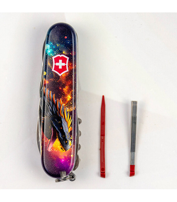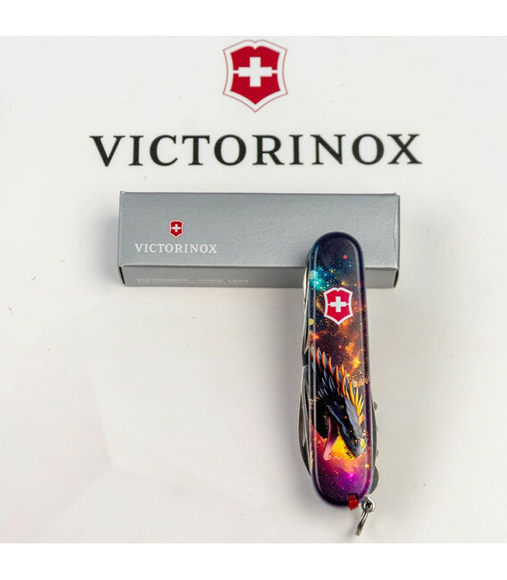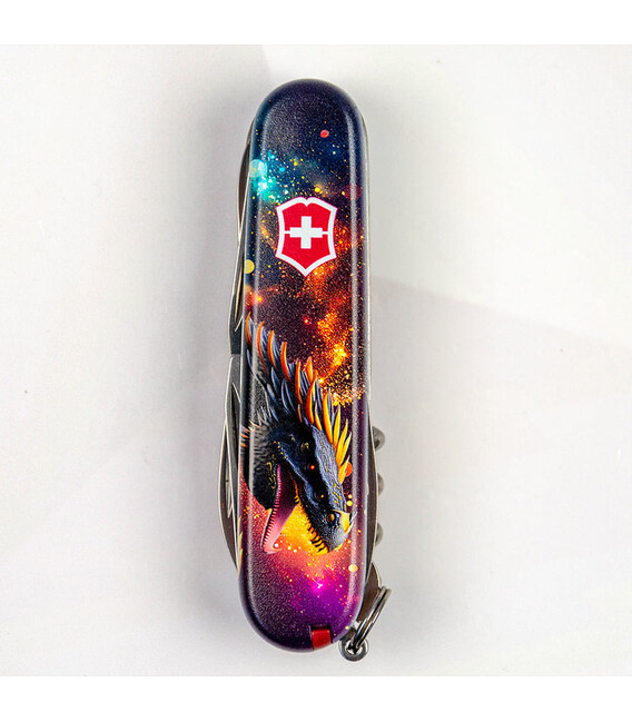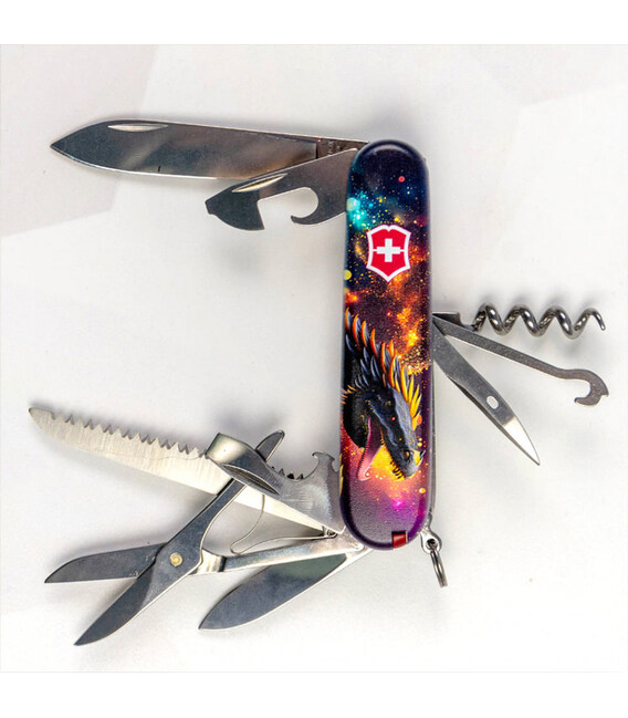 Многозадачный карманный нож Victorinox HUNTSMAN на 15 функций с космическим дизайном накладок Звёздный дракон. Согласно восточному календарю, хозяином 2024 года будет Дракон, который символизирует силу, честь, благородство. Искренне верим, что следующий год поможет нам в полной мере продемонстрировать эти свои качества, а складной нож Victorinox с Драконом станет оригинальным напоминанием об этом. Идеальный подарок на Новый год, коллекционерам и родным, знакомым «драконам», а также всем любителям мира фэнтези.HUNTSMAN – популярная модель из коллекции средних складных ножей длиной 91 мм. Станет незаменимым помощником дома, на даче, в походе: перепилить небольшое бревно или доску, отрезать, открыть банку или бутылку, открутить или закрутить, привести в порядок ногти, обрезать лишние нитки на одежде – Victorinox Huntsman готов ко всему. Незаменимый набор инструментов, чтобы подготовиться к ежедневных вызовам. Каждый из инструментов порадует безупречной работой и долговечностью.Информация о ноже Victorinox HUNTSMAN [1.3713.3.Z3220p]:✔ Праздничная линейка Huntsman Zodiac 2024 с Драконами.✔ Эксклюзивные пластиковые накладки в дизайне [Звёздный дракон].✔ Тип нанесения рисунка: высококачественная цифровая полноцветная запечатка накладок.✔ Матовая печать с покрытием головы дракона глянцевым лаком для эффектной детализации.✔ Замена пинцета и зубочистки на красные для гармоничного сочетания с дизайном.✔ Количество функций: 15.✔ Средний размер складного ножа: длина 91 мм – ширина 26 мм – толщина 21 мм✔ Вес ножа: 97 г✔ Комплектация: нож Huntsman, коробочка, гарантия-сертификат.✔ Нож изготовлен в Швейцарии.✔ Victorinox AG гарантирует, что все ножи из первоклассной нержавеющей стали.1. большое гладкое лезвие (длина 6 см)2. лезвие меньшего размера (длина 3,5 см)3-5. открывалка для бутылок с плоской отверткой 6 мм на конце и пазом для изоляции6-7. консервный нож с плоской отверткой 3 мм на конце8. ножницы с пружинным механизмом9. пила по дереву10. штопор11. шило с функцией кернера или дырокола12. пинцет в передней накладке13. зубочистка в задней накладке14. стальной крючок15. кольцо для крепления