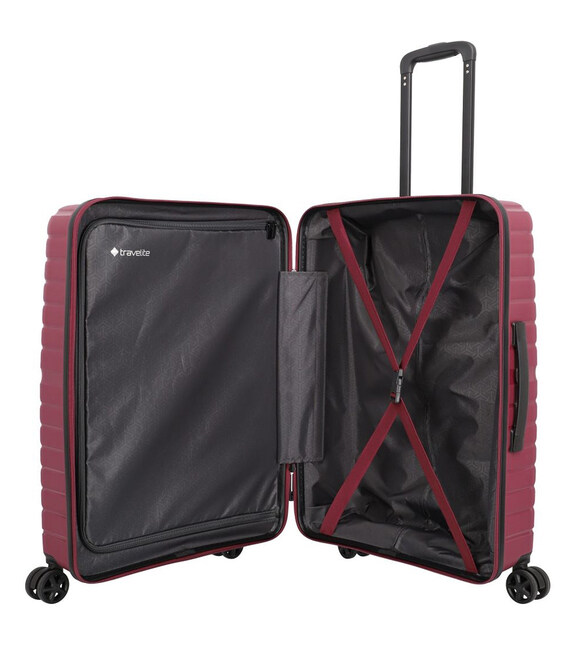Travelite TRIENT [Bordeaux, М] на 67 литров – яркий полипропиленовый чемодан среднего размера с TSA замком. Просторный, стильный и универсальный багаж для достаточно большого количества вещей, поэтому, в зависимости от ваших привычек собирать вещи, подойдет для одно- или двухнедельной поездки.Информация о чемодане Travelite TRIENT 076548 70✔ Средний М размер (В х Ш х Т): 66 х 45 x 26 см.✔ Легкий вес: 3 кг✔ Дизайн: Bordeaux (бордовый/вишневый цвет; матовая текстурированная поверхность с горизонтальными глянцевыми полосами).✔ Гибкий пластиковый корпус: полипропилен.✔ Прочная подкладка из полиэстера.✔ Выносливая багажная молния с двумя бегунками.✔ Встроенный в верхнюю часть корпуса кодовый замок TSA.✔ 4 маневренных колеса с гладким протектором.✔ Выдвижная черная ручка с фиксацией на разной высоте.✔ Две дополнительные ручки (верхняя и боковая) для поднятия и переноски в руках.• Просторная камера с равномерным делением на 2 секции.• В первой секции - перегородка на молнии.• Во второй – х-образные ремни-резинки для фиксации вещей.TRIENT – коллекция долговечных полипропиленовых чемоданов, которые характеризуются прочностью, легкостью и гибкостью, что позволяет перевозить чемодан заполненным не полностью без страха, что корпус треснет, если на него поставить другой багаж. Устойчивая к царапинам и потертостям поверхность долго сохраняет эстетичный внешний вид. Сверху находится утопленный в корпус TSA замок, который сохранит ваши ценности, отвечая стандартам безопасности. Пластиковые чемоданы завоевали популярность не только благодаря стильному дизайну, но также и надежной защите вашего багажа от ударов, дождя, снега. А 4-колесный чемодан - идеальный попутчик в аэропортах и вокзалах, ведь катить его можно простыми толчками рядом с собой без особых усилий.Travelite - популярный немецкий бренд, который с 1949 года производит качественную и стильную багажную продукцию.