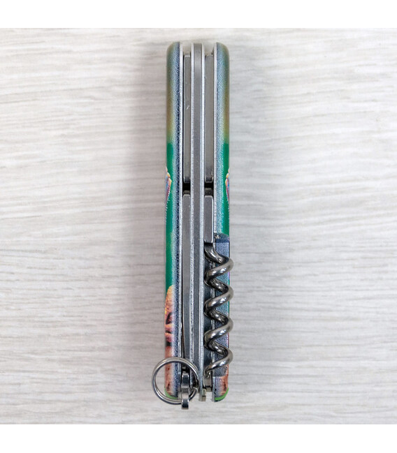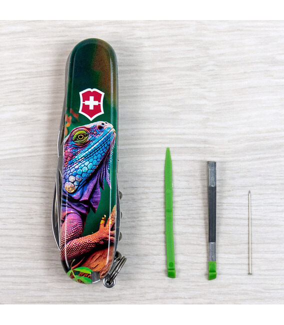 Карманный нож CAMPER Хамелеон с качественной цветной печатью на обеих накладках и покрытием глянцевым лаком. Эксклюзивное предложение для украинских поклонников легендарной ножевой продукции Victorinox. Стандартные для ножа CAMPER инструменты, среди которых супер острая пила по дереву, пополнились стальной шпилькой.Коллекция ANIMAL, кроме дизайна накладок, отличается заменой пинцета и зубочистки на цветные для наиболее гармоничного сочетания с рисунком, а также расширением комплектации – нож сразу с булавкой. Изменения коснулись и упаковки – ножи ANIMAL помещены в коробку Victorinox с демонстрационной вставкой для эффектной презентации. А эстетичные накладки делают нож прекрасным образцом коллекционирования.Информация о складном ноже Victorinox 1.3613.3.F1020pw✔ Спецвыпуск Victorinox ANIMAL (начало выпуска 2024 год, доступен только в Украине).✔ Эксклюзивный дизайн [Хамелеон] в комплектации ножа CAMPER.✔ Тип нанесения рисунка: полная цифровая полноцветная запечатка на пластиковых накладках.✔ Покрытие накладок глянцевым лаком (GLOSS) для защиты и «блестящего» вида.✔ Печать и покрытием лаком реализовано на высококачественном профессиональном оборудовании в Украине.✔ Замена пинцета и зубочистки на зеленые для гармоничного сочетания с дизайном.✔ В комплектацию добавлена булавка.✔ Количество функций: 13+1.✔ Замена упаковки на подарочный футляр с прозрачным окошком (внутри – оригинальный сертификат-гарантия).✔ Нож изготовлен в Швейцарии, а Victorinox AG гарантирует, что все ножи из первоклассной нержавеющей стали.1. лезвие длиной 6 см2. лезвие длиной 3,5 см3-5. открывалка для бутылок с плоской отверткой 6 мм на конце и пазом для изоляции6-7. консервный нож с плоской отверткой 3 мм на конце8. пила по дереву9. шило с функцией кернера или дырокола10. пинцет в передней накладке11. зубочистка в задней накладке12. штопор13. стальное кольцо14. булавка (в слоте возле штопора)