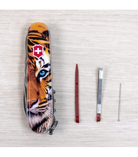 Карманный нож CLIMBER Тигр с качественной цветной печатью на обеих накладках и покрытием глянцевым лаком. Эксклюзивное предложение для украинских поклонников легендарной ножевой продукции Victorinox. Стандартные для ножа CLIMBER инструменты, среди которых ножницы и многоцелевой крючок, пополнились стальной шпилькой.Коллекция ANIMAL, кроме дизайна накладок, отличается заменой пинцета и зубочистки на цветные для наиболее гармоничного сочетания с рисунком, а также расширением комплектации – нож сразу с булавкой. Изменения коснулись и упаковки – ножи ANIMAL помещены в коробку Victorinox с демонстрационной вставкой для эффектной презентации. А эстетичные накладки делают нож прекрасным образцом коллекционирования.Информация о складном ноже Victorinox 1.3703.F1030pw✔ Спецвыпуск Victorinox ANIMAL (начало выпуска 2024 год, доступен только в Украине).✔ Эксклюзивный дизайн [Тигр] в комплектации ножа CLIMBER.✔ Тип нанесения рисунка: полная цифровая полноцветная запечатка на пластиковых накладках.✔ Покрытие накладок глянцевым лаком (GLOSS) для защиты и «блестящего» вида.✔ Печать и покрытием лаком реализовано на высококачественном профессиональном оборудовании в Украине.✔ Замена пинцета и зубочистки на красные для гармоничного сочетания с дизайном.✔ В комплектацию добавлена булавка.✔ Количество функций: 14+1.✔ Замена упаковки на подарочный футляр с прозрачным окошком (внутри – оригинальный сертификат-гарантия).✔ Нож изготовлен в Швейцарии, а Victorinox AG гарантирует, что все ножи из первоклассной нержавеющей стали.1. лезвие длиной 6 см2. лезвие длиной 3,5 см3-5. открывалка для бутылок с плоской отверткой 6 мм на конце и пазом для изоляции6-7. консервный нож с плоской отверткой 3 мм на конце8. ножницы с пружинным механизмом9. крючок10. шило с функцией кернера или дырокола11. пинцет в передней накладке12. зубочистка в задней накладке13. штопор14. стальное кольцо15. булавка (в слоте возле штопора)