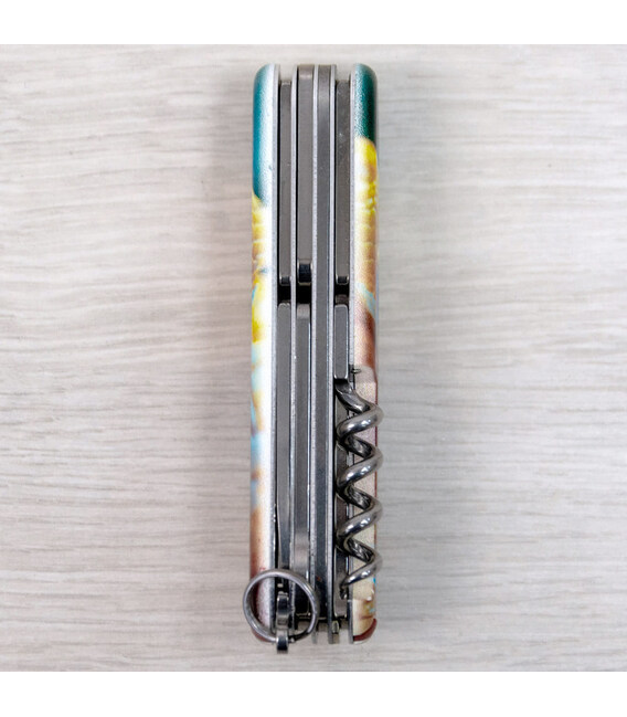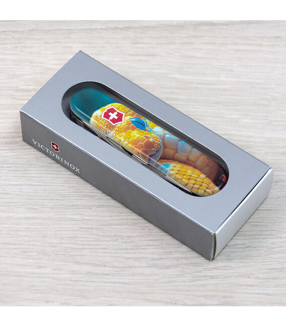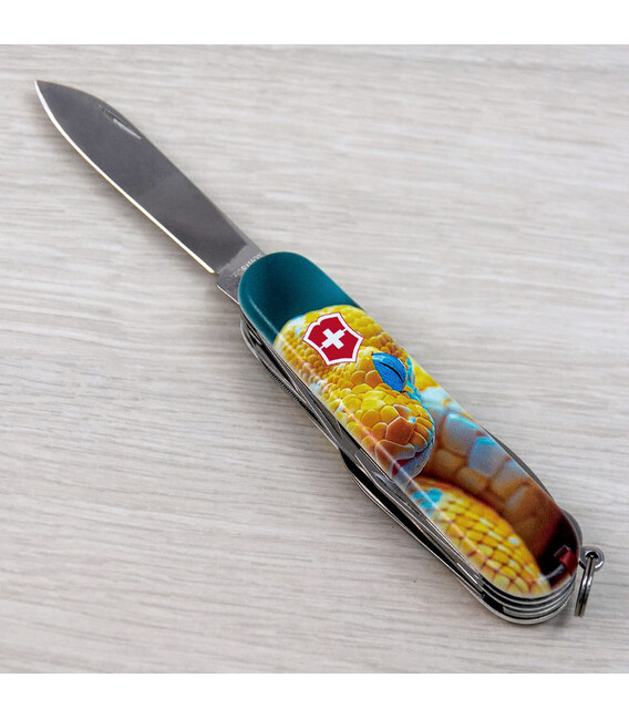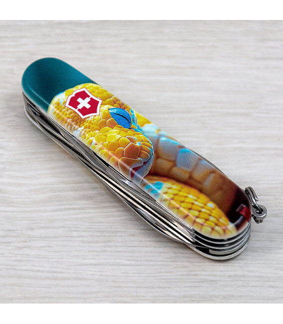 Эксклюзивный мультизадачный складной нож MOUNTAINEER с изображением змея на обеих накладках и покрытием матовым лаком. Специальное предложение для украинских поклонников культовых ножей Victorinox. С инструментами MOUNTAINEER вам по силам и ремонт, и туристический поход, а у этой модели набор пополнился еще и стальной шпилькой.Информация о складном ноже Victorinox 1.3743.7.F1050pw✔ Спецвыпуск Victorinox ANIMAL (доступен только в Украине; начало выпуска 2024 год).✔ Эксклюзивный дизайн [Змей] в комплектации ножа MOUNTAINEER.✔ Тип нанесения рисунка: полная цифровая полноцветная запечатка на пластиковых накладках.✔ Покрытие накладок матовым лаком (MAT) для защиты и эстетичного вида.✔ Печать и покрытием лаком реализовано на высококачественном профессиональном оборудовании в Украине.✔ Замена зубочистки и пинцета на красные для гармоничного сочетания с дизайном.✔ В комплектацию добавлена булавка.✔ Количество функций: 18+1.✔ Замена упаковки на подарочный футляр с прозрачным окошком (внутри – оригинальный сертификат-гарантия).✔ Нож изготовлен в Швейцарии и Victorinox AG гарантирует, что все ножи из первоклассной нержавеющей стали.1. лезвие 6 см2. меньшее лезвие 3,5 см3-5. открывалка для бутылок с плоской отверткой 6 мм на конце и пазом для изоляции6-7. консервный нож с плоской отверткой 3 мм на конце8. пила по металлу9. – напильник для металла10. – пилочка для ногтей11. – очиститель для ногтей12. ножницы с пружинным механизмом13. шило с функцией кернера или дырокола14. пинцет в передней накладке15. зубочистка в задней накладке16. кольцо для крепления17. крючок18. штопор19. стальная булавка (в слоте возле крючка)Коллекция ANIMAL, кроме дизайна накладок, отличается заменой пинцета и зубочистки на цветные для наиболее гармоничного сочетания с рисунком, а также расширением комплектации – нож сразу с булавкой. Изменения коснулись и упаковки – ножи ANIMAL помещены в коробку Victorinox с демонстрационной вставкой для эффектной презентации. А эстетичные накладки делают нож прекрасным образцом коллекционирования.