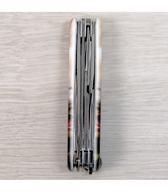 Многозадачный карманный нож FISHERMAN с милой мордочкой панды на обеих накладках и покрытием матовым лаком. Эксклюзивное предложение для украинских поклонников культовых ножей Victorinox. Завидный для FISHERMAN (Рыбак) набор инструментов, среди которых выделяется рыбочистка с приспособлением для вынимания рыболовных крючков, пополнился еще и стальной булавкой. А эстетичные накладки делают нож прекрасным образцом коллекционирования.Информация о складном ноже Victorinox 1.4733.7.F1110pw✔ Спецвыпуск Victorinox ANIMAL (доступен только в Украине; начало выпуска 2024 год).✔ Эксклюзивный дизайн [Панда] в комплектации ножа FISHERMAN.✔ Тип нанесения рисунка: полная цифровая полноцветная запечатка на пластиковых накладках.✔ Покрытие накладок матовым лаком (MAT) для защиты и эстетичного вида.✔ Печать и покрытием лаком реализовано на высококачественном профессиональном оборудовании в Украине.✔ Замена зубочистки и пинцета на красные для гармоничного сочетания с дизайном.✔ В комплектацию добавлена булавка.✔ Количество функций: 18+1.✔ Замена упаковки на подарочный футляр с прозрачным окошком (внутри – оригинальный сертификат-гарантия).✔ Нож изготовлен в Швейцарии и Victorinox AG гарантирует, что все ножи из первоклассной нержавеющей стали.1. лезвие 6 см2. меньшее лезвие 3,5 см3-5. открывалка для бутылок с плоской отверткой 6 мм на конце и пазом для изоляции6-7. консервный нож с плоской отверткой 3 мм на конце8-11. рыбочистка с раздвоенным концом для крючков и линейкой (в дюймах и см)12. крестовая отвертка 1/213. ножницы с пружинным механизмом14. шило с функцией кернера или дырокола15. пинцет в передней накладке16. зубочистка в задней накладке17. стальное кольцо18. крючок19. булавка (в слоте возле крючка)
