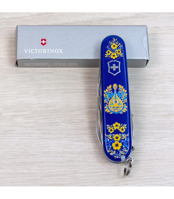 Швейцарский складной нож SPARTAN UKRAINE [Украинские мотивы; синие накладки]. Специальное предложение для украинских поклонников и коллекционеров бренда Victorinox. Эксклюзивный дизайн, центральным элементом которого выступил украинский народный инструмент - кобза.Отличный набор инструментов в карманном формате, чтобы во всеоружии встретить новый день. Базовый для средних складных ножей инструментарий с компактным двурядным размещением инструментов, который всегда найдет предназначение в быту и на досуге; в городе и на природе.Складной нож Victorinox 1.3603.2.T1370u✔ Спецвыпуск VICTORINOX UKRAINE (начало выпуска 2024 год, доступен только в Украине).✔ Эксклюзивный дизайн [Украинские мотивы] в комплектации ножа SPARTAN.✔ Синие глянцевые накладки из ударопрочного пластика (целлидор).✔ Тип нанесения рисунка: устойчивая к истиранию УФ печать на лицевой накладке.✔ Количество функций: 12.✔ Средний размер складного ножа: длина 91 мм – ширина 26 мм – толщина 14 мм✔ Вес ножа: 59 г✔ Нож изготовлен в Швейцарии.✔ Патриотический дизайн выполнен на высококачественном профессиональном оборудовании в Украине.✔ Victorinox AG гарантирует, что все ножи из первоклассной нержавеющей стали.✔ Оригинальная картонная коробочка Victorinox с сертификатом-гарантией.1. лезвие длиной 6 см2. лезвие длиной 3,5 см3-5. открывалка для бутылок с плоской отверткой 6 мм на конце и пазом для изоляции6-7. консервный нож с плоской отверткой 3 мм на конце8. штопор9. шило с функцией кернера или дырокола10. пинцет в передней накладке11. пластиковая зубочистка в задней накладке12. стальное кольцо