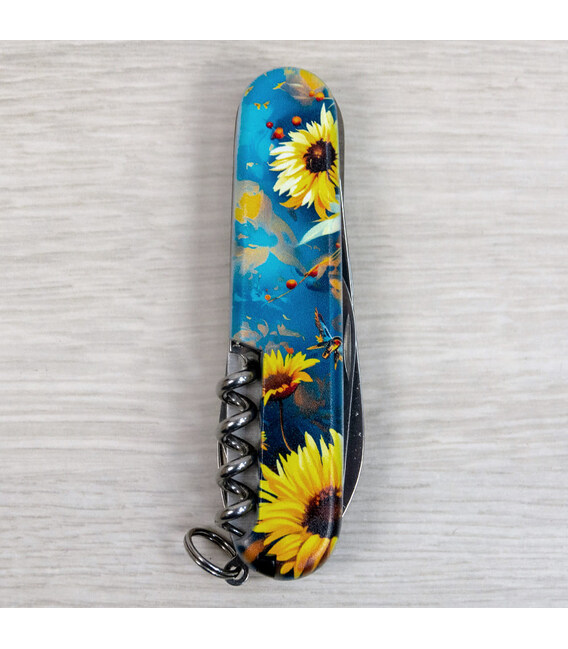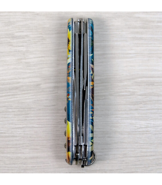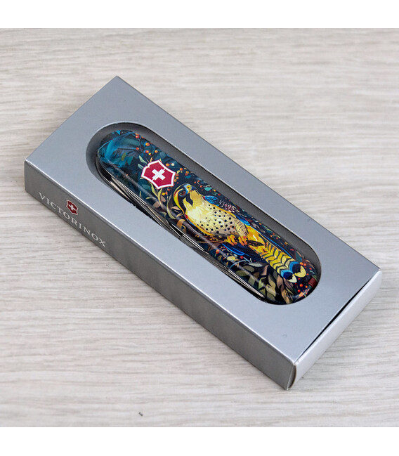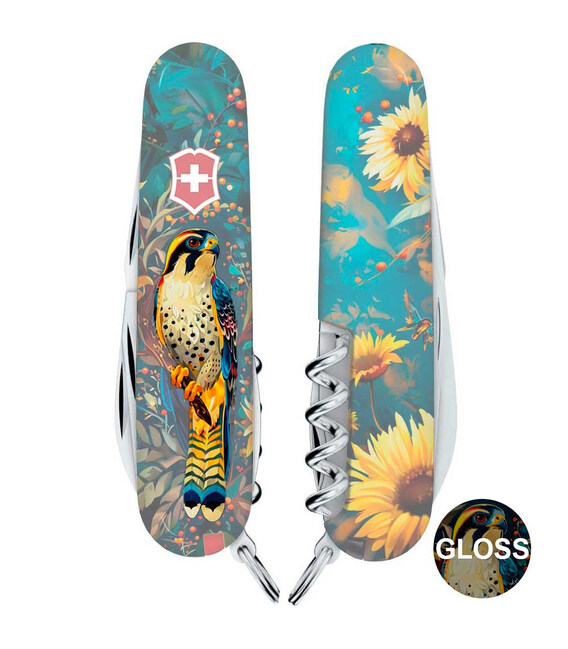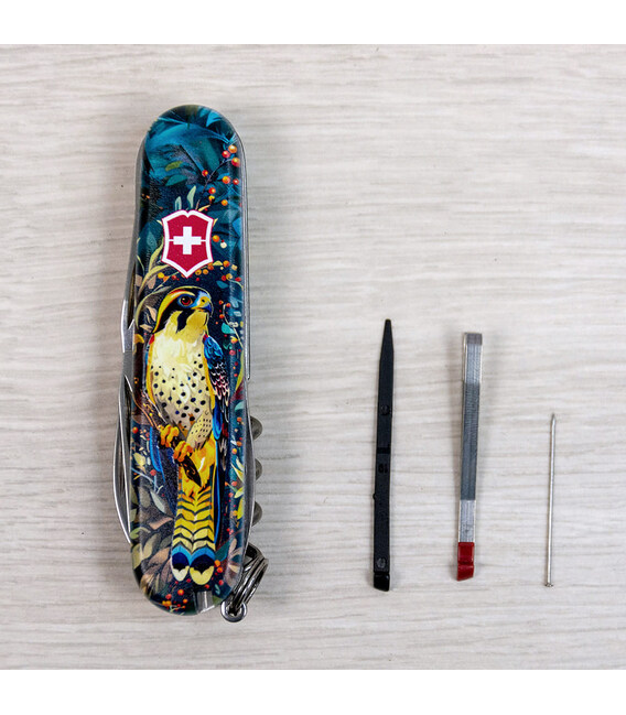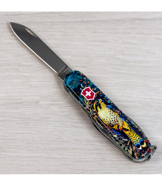 Швейцарский складной нож CAMPER UKRAINE [Величественный Сокол] с качественной цветной печатью на обеих накладках и комбинированным матово-глянцевым лаковым покрытием. Профессиональное выполнение дизайна в украинской стилистике. Специальное эстетичное предложение для украинских поклонников и коллекционеров бренда Victorinox.Карманный нож CAMPER с супер острой пилой по дереву, поэтому идеальный выбор для туристов и всех, кто любит проводить время на свежем воздухе. Эта эксклюзивная модель получила дополнительно в комплектацию еще и булавку. Полезный для средних складных ножей инструментарий с компактным трехрядным размещением инструментов. Практичный и знаковый подарок в красивой упаковке с прозрачным окошком, что позволяет видеть дизайн сразу и подчеркивает эксклюзивность подарка.Складной нож Victorinox 1.3613.3.T3180pw✔ Спецвыпуск VICTORINOX UKRAINE (начало выпуска 2024 год, доступен только в Украине).✔ Эксклюзивный дизайн [Величественный Сокол] в комплектации ножа CAMPER.✔ Тип нанесения рисунка: цифровая полноцветная запечатка на оригинальных пластиковых накладках.✔ Матово-глянцевый дизайн (MAT/GLOSS): накладки покрыты матовым лаком, а сокол - глянцевым.✔ Печать и покрытие лаком на высококачественном профессиональном оборудовании в Украине.✔ Замена пинцета на красный, а зубочистки на черную для гармоничного сочетания с дизайном.✔ В комплектацию добавлена булавка.✔ Количество функций: 13+1.✔ Средний размер складного ножа: длина 91 мм – ширина 26 мм – толщина 18 мм✔ Презентабельная подарочная коробка Victorinox с прозрачным окошком (внутри – оригинальный сертификат-гарантия).✔ Нож изготовлен в Швейцарии.✔ Victorinox AG гарантирует, что все ножи из первоклассной нержавеющей стали.1. лезвие длиной 6 см2. лезвие длиной 3,5 см3-5. открывалка для бутылок с плоской отверткой 6 мм на конце и пазом для изоляции6-7. консервный нож с плоской отверткой 3 мм на конце8. пила по дереву9. шило с функцией кернера или дырокола10. пинцет в передней накладке11. зубочистка в задней накладке12. штопор13. стальное кольцо14. булавка (в слоте возле штопора)