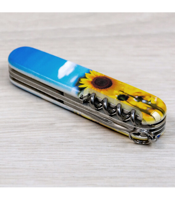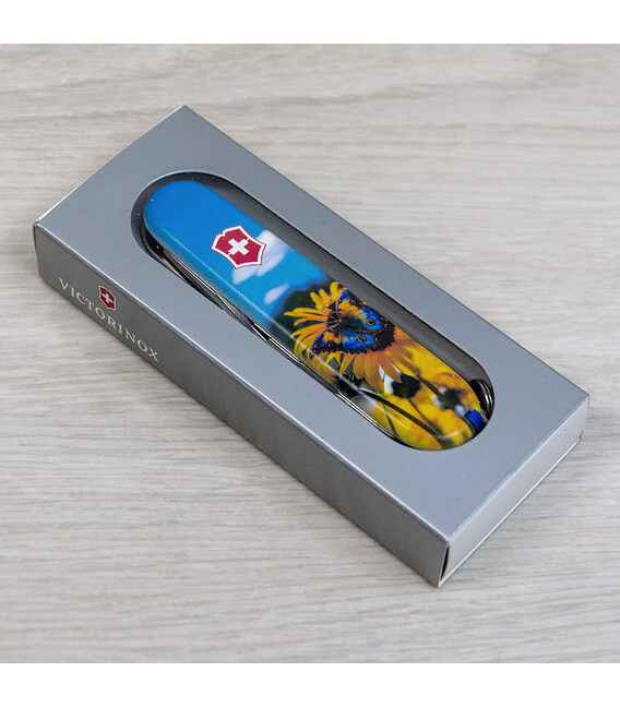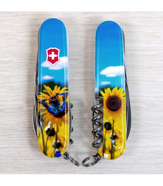 Швейцарский карманный нож CAMPER UKRAINE [Подсолнечники и бабочка] с качественной цветной печатью на обеих накладках, покрытых матовым лаком. Профессиональное выполнение дизайна в украинской стилистике. Эстетика на высоте благодаря матовому покрытию, которое также защитит накладки от случайных царапин и отпечатков пальцев. Специальное предложение для украинских поклонников и коллекционеров бренда Victorinox.Эта модель CAMPER получила дополнительно в комплектацию еще и булавку. Идеальный карманный нож с супер острой пилой по дереву для туристов и всех, кто любит проводить время на свежем воздухе. Полезный для средних складных ножей инструментарий с компактным трехрядным размещением инструментов. Практичный и знаковый подарок в красивой упаковке с прозрачным окошком, что позволяет видеть дизайн сразу и подчеркивает эксклюзивность подарка.Складной нож Victorinox 1.3613.7.T3200pw✔ Спецвыпуск VICTORINOX UKRAINE (начало выпуска 2024 год, доступен только в Украине).✔ Эксклюзивный дизайн [Подсолнечники и бабочка] в комплектации ножа CAMPER.✔ Тип нанесения рисунка: цифровая полноцветная запечатка на оригинальных пластиковых накладках.✔ Накладки покрыты матовым лаком (MAT) для защиты и эстетичного вида.✔ Печать и покрытие лаком на высококачественном профессиональном оборудовании в Украине.✔ Замена пинцета на синий для гармоничного сочетания с дизайном.✔ В комплектацию добавлена булавка.✔ Количество функций: 13+1.✔ Средний размер складного ножа: длина 91 мм – ширина 26 мм – толщина 18 мм✔ Презентабельная подарочная коробка Victorinox с прозрачным окошком (внутри – оригинальный сертификат-гарантия).✔ Нож изготовлен в Швейцарии.✔ Victorinox AG гарантирует, что все ножи из первоклассной нержавеющей стали.1. лезвие длиной 6 см2. лезвие длиной 3,5 см3-5. открывалка для бутылок с плоской отверткой 6 мм на конце и пазом для изоляции6-7. консервный нож с плоской отверткой 3 мм на конце8. пила по дереву9. шило с функцией кернера или дырокола10. пинцет в передней накладке11. зубочистка в задней накладке12. штопор13. стальное кольцо14. булавка (в слоте возле штопора)