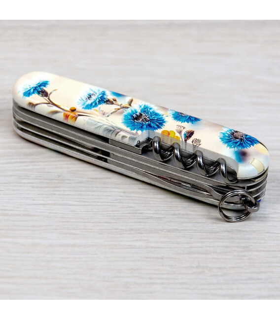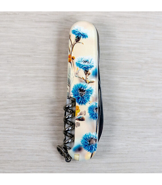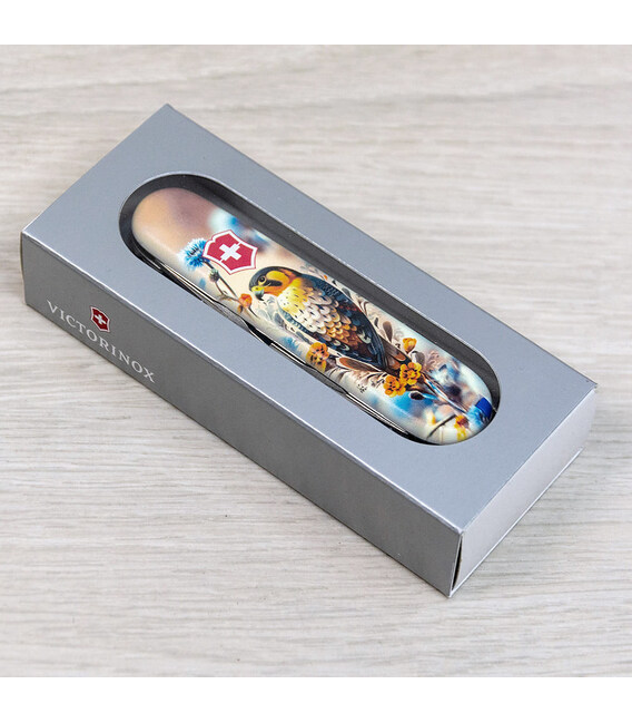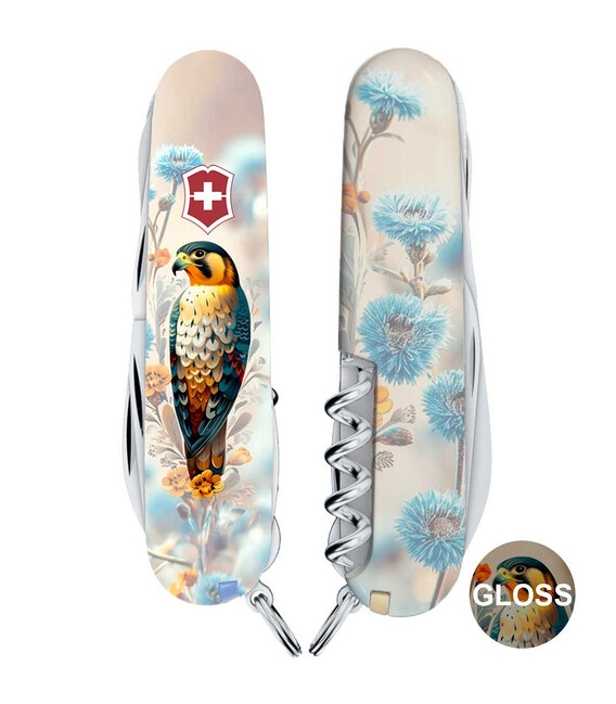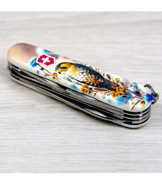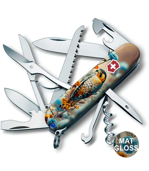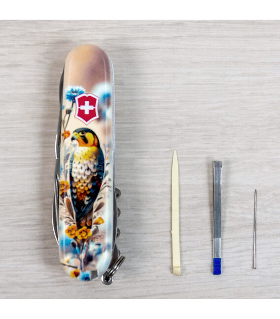 Многофункциональный нож HUNTSMAN UKRAINE [Благородный Сокол] с качественной цветной печатью на обеих накладках и комбинированным матово-глянцевым лаковым покрытием. Профессиональное выполнение дизайна с украинскими смыслами. Специальное эстетичное предложение для украинских поклонников и коллекционеров бренда Victorinox.Серия Huntsman объединяет карманные ножи среднего размера и предлагает большой набор инструментов для разной активности на свежем воздухе, а эта эксклюзивная модель получила дополнительно в комплектацию еще и булавку. Станет незаменимым помощником дома, на даче, в походе: перепилить небольшое бревно или доску, отрезать, открыть банку или бутылку, открутить или закрутить, привести в порядок ногти, обрезать лишние нитки на одежде – Victorinox Huntsman готов ко всему. Незаменимый набор инструментов, чтобы подготовиться к ежедневных вызовам. А красивая коробочка с прозрачным окошком позволяет видеть дизайн сразу и подчеркивает эксклюзивность подарка.Складной нож Victorinox 1.3713.7.T3260pw✔ Спецвыпуск VICTORINOX UKRAINE (начало выпуска 2024 год, доступен только в Украине).✔ Эксклюзивный дизайн [Благородный Сокол] в комплектации ножа HUNTSMAN.✔ Тип нанесения рисунка: полная цифровая полноцветная запечатка на оригинальных пластиковых накладках.✔ Матово-глянцевый дизайн (MAT/GLOSS): накладки покрыты матовым лаком, а сокол - глянцевым.✔ Печать и покрытие лаком на высококачественном профессиональном оборудовании в Украине.✔ Замена пинцета на синий для гармоничного сочетания с дизайном.✔ В комплектацию добавлена булавка.✔ Количество функций: 15+1.✔ Средний размер складного ножа: длина 91 мм – ширина 26 мм – толщина 21 мм✔ Презентабельная подарочная коробка Victorinox с прозрачным окошком (внутри – оригинальный сертификат-гарантия).✔ Нож изготовлен в Швейцарии.✔ Victorinox AG гарантирует, что все ножи из первоклассной нержавеющей стали.1. лезвие длиной 6 см2. лезвие длиной 3,5 см3-5. открывалка для бутылок с плоской отверткой 6 мм на конце и пазом для изоляции6-7. консервный нож с плоской отверткой 3 мм на конце8. пила по дереву9. ножницы с пружинным механизмом10. шило с функцией кернера или дырокола11. пинцет в передней накладке12. зубочистка в задней накладке13. стальное кольцо14. крючок15. штопор16. булавка (в слоте возле штопора)