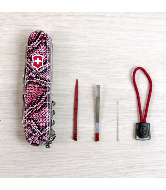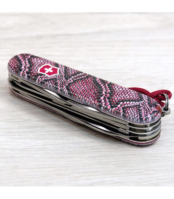 Складной нож HUNTSMAN DESIGN [Принт Кожа питона] на 15 функций в этом эксклюзивном выпуске дополнен булавкой и цветным темлячком. Легендарное качество швейцарских армейских ножей Victorinox в сочетании с профессионально выполненной печатью, которая покрывает всю поверхность накладок. Эта модель займет достойное место в вашей коллекции карманных ножей Victorinox, а также станет стильным и полезным подарком к Новому 2025 году или людям, родившимся в год Змеи.Информация о складном ноже Victorinox 1.3713.R2200pk✔ Эксклюзивный выпуск VICTORINOX с дизайнами, доступными только в Украине.✔ Комплектация ножа HUNTSMAN с накладками [Принт Кожа питона].✔ Хорошо детализированная полноцветная цифровая печать на оригинальных пластиковых накладках.✔ Накладки покрыты защитным матовым лаком (MAT).✔ Персонализация печатью и покрытие лаком выполнены на высококачественном профессиональном оборудовании в Украине.✔ Замена пинцета и зубочистки на красные для эстетичного сочетания с дизайном накладок.✔ В комплектацию добавлены булавка и подвеска-темляк.✔ Количество функций: 15+2.✔ Подарочная коробка Victorinox с прозрачным окошком + оригинальный сертификат-гарантия.✔ Нож швейцарского производства из высококлассной нержавеющей стали.1. основное лезвие (6 см)2. меньшее лезвие (3,5 см)3-5. открывалка, комбинированная с отверткой 6 мм и пазом для изоляции6-7. консервный нож с отверткой 3 мм8. пила по дереву9. ножницы с пружинным механизмом10. штопор11. шило с функцией кернера или дырокола12. пинцет в передней накладке13. зубочистка в задней накладке14. стальной крючок15. кольцо для крепления16. стальная булавка17. красный темляк Victorinox Оригинальные швейцарские ножи Victorinox в магазине эксклюзивных аксессуаров со всего мира chemodanoff.com.ua.Гарантия качества и быстрая доставка.