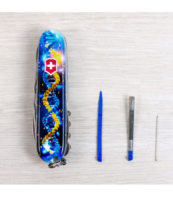 Складной нож HUNTSMAN UKRAINE [ДНК Украинца] с качественной цветной печатью на обеих накладках. Профессиональное исполнение эксклюзивного дизайна. Специальное эстетичное предложение для украинских поклонников и коллекционеров бренда Victorinox.Серия Huntsman объединяет карманные ножи среднего размера и предлагает большой набор инструментов для разной активности на свежем воздухе, а эта эксклюзивная модель получила дополнительно в комплектацию еще и булавку. Станет незаменимым помощником дома, на даче, в походе: перепилить небольшое бревно или доску, отрезать, открыть банку или бутылку, открутить или закрутить, привести в порядок ногти, обрезать лишние нитки на одежде – Victorinox Huntsman готов ко всему. Незаменимый набор инструментов, чтобы подготовиться к ежедневных вызовам. А красивая коробочка с прозрачным окошком позволяет видеть дизайн сразу и подчеркивает эксклюзивность подарка.Информация о складном ноже Victorinox 1.3713.3.T3270pw✔ Спецвыпуск VICTORINOX UKRAINE (начало выпуска 2024 год, доступен только в Украине).✔ Эксклюзивный дизайн [ДНК Украинца] в комплектации ножа HUNTSMAN.✔ Хорошо детализированная полноцветная цифровая печать на оригинальных пластиковых накладках.✔ Накладки покрыты глянцевым лаком (GLOSS).✔ Персонализация печатью и покрытие лаком выполнены на высококачественном профессиональном оборудовании в Украине.✔ Замена пинцета и зубочистки на синие для эстетичного сочетания с дизайном накладок.✔ В комплектацию добавлена булавка.✔ Количество функций: 15+1.✔ Подарочная коробка Victorinox с прозрачным окошком + оригинальный сертификат-гарантия.✔ Нож швейцарского производства из высококлассной нержавеющей стали.1. основное лезвие (6 см)2. меньшее лезвие (3,5 см)3-5. открывалка, комбинированная с отверткой 6 мм и пазом для изоляции6-7. консервный нож с отверткой 3 мм8. пила по дереву9. ножницы с пружинным механизмом10. штопор11. шило с функцией кернера или дырокола12. пинцет в передней накладке13. зубочистка в задней накладке14. стальной крючок15. кольцо для крепления16. стальная булавка Оригинальные швейцарские ножи Victorinox в магазине эксклюзивных аксессуаров со всего мира chemodanoff.com.ua.Гарантия качества и быстрая доставка.