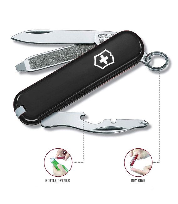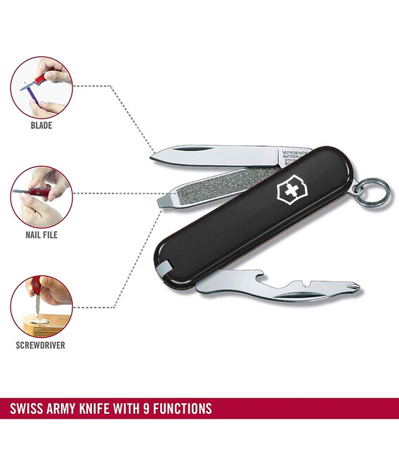Victorinox RALLY (черный) – маленький швейцарский нож-брелок 58 мм на 9 функций. Многозадачный карманный нож с пилочкой и отверткой Phillips, который понравится как взрослым, так и детям. Привести в порядок ваш маникюр, заточить карандаш или произвести небольшой ремонт, с такой работящей крохой вам все по плечу. Все инструменты гарантируют безупречную, долговечную работу. Легендарное качество стали Victorinox и профессиональная технология обработки сделают этот нож вечным помощником на каждый день.Информация о ноже Victorinox RALLY [0.6163.3]✔ Изготовлен из высококлассной нержавеющей стали.✔ Черные накладки-рукоять из ударопрочного пластика с логотипом бренда.✔ 9 функций.✔ Легкий вес: 22 г✔ Коллекция маленьких складных ножей Victorinox (длина х ширина х толщина), мм: 58 х 19 х 9✔ В наборе с маленьким черным чехлом из кожзама.✔ Сделано в Швейцарии.1. маленькое стальное лезвие2. открывалка3. - крестовая отвертка 0/1, магнитная4. - паз для зачистки проводов5. пилочка для ногтей6. - плоская отвертка 2,5 мм7. пинцет в передней накладке8. зубочистка в задней накладке9. кольцо для крепления VICTORINOX – стабильно высокое качество ножевой продукции с 1884 года.Подлинная продукция, профессиональный гарантийный сервис и быстрая доставка.