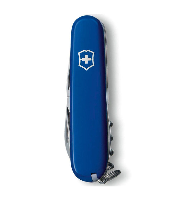 Victorinox CAMPER (синий) – швейцарский карманный нож 91 мм на 13 функций. Camper - незаменимый инструмент для распилки дерева или обрезки тентовых канатов в походах. Наряду с палаткой, спальным мешком и переносной походной печью, этот нож займет почетное место в экипировке всех, кто любит проводить время на свежем воздухе. Все инструменты гарантируют безупречную, долговечную работу, не люфлят. Тип ножевого замка Slip-joint - это проверенная временем конструкция, которая фиксирует лезвие в положении к рукояти и надежно защищает от запрокидывания во время работы.Информация о ноже Victorinox CAMPER [1.3613.2]✔ Нож швейцарского производства из первоклассной нержавеющей стали.✔ Синие накладки-рукоять из ударопрочного пластика с логотипом бренда.✔ 13 функций.✔ Средний размера ножа Victorinox (длина х ширина х толщина), мм: 91 х 26 х 18✔ На нож распространяется пожизненная гарантия качества.✔ Картонная коробочка с оригинальным сертификатом.✔ Сделано в Швейцарии.1. большое стальное лезвие2 лезвие меньшего размера3. пила по дереву4. открывалка для бутылок5. – плоская отвертка 6 мм6. – паз для устранения изоляции7. открывалка для консервных банок8. – плоская отвертка 3 мм9. штопор10. шило (дырокол)11. пинцет в передней накладке12. зубочистка в задней накладке13. стальное кольцо для крепления Обратите внимание, что все ножи Victorinox 91 мм с пластиковыми накладками имеют специальное отверстие под булавку в накладке возле штопоре (в комплектацию к данной модели булавка не входит и продается отдельно).