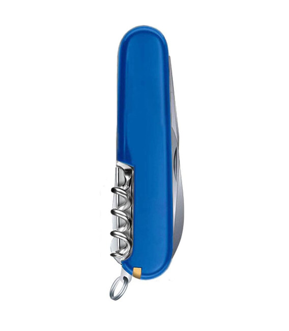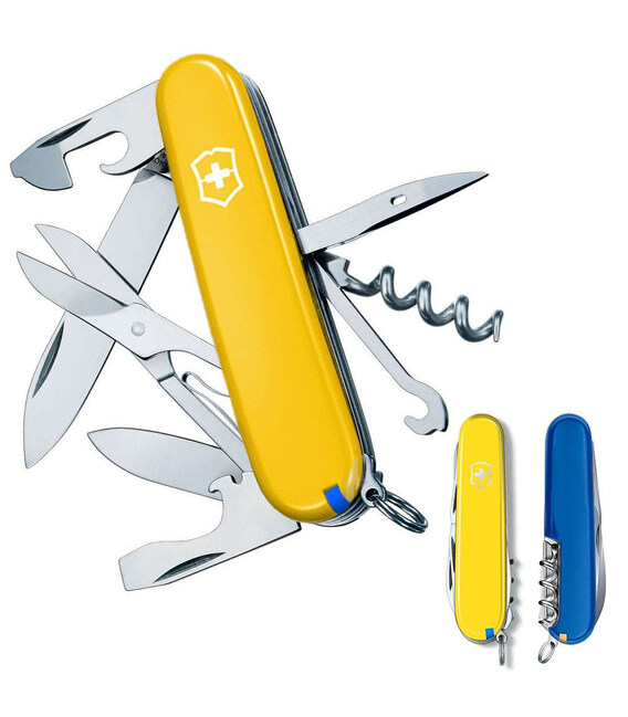 Victorinox CLIMBER UKRAINE (желто-синий) – средний карманный нож 91 мм на 14 функций. Ограниченное предложение в цветах украинского государственного флага.Climber - швейцарский армейский нож с солидным функционалом для выполнения большого спектра работ. Содержит два очень острых лезвия разной длины, удобные ножницы как для быстрого маникюра, так и обрезки ниток. Открывалки (для бутылок и консервов) дополнены плоскими отвертками на конце. Многозадачный крючок, штопор и шило. В накладках вы найдете не менее полезный набор приспособлений, а стальное кольцо позволит прикрепить нож к цепочке или темляку. Все инструменты гарантируют безупречную работу и не люфлят.Информация о ноже Victorinox CLIMBER UKRAINE [1.3703.8.2]✔ Эксклюзивный нож из патриотической коллекции Climber Ukraine.✔ Нож швейцарского производства из первоклассной нержавеющей стали.✔ Желто-синие накладки на рукоять из глянцевого пластика с логотипом бренда.✔ 14 функций.✔ Карманный нож Victorinox в сложенном виде (длина х ширина х толщина), мм: 91 х 26 х 18✔ На нож распространяется пожизненная гарантия качества.✔ Картонная коробочка с оригинальным сертификатом.✔ Сделано в Швейцарии.1. большое лезвие с гладкой кромкой2. лезвие меньшего размера 3. ножницы с пружинным механизмом4. открывалка 5. – плоская отвертка 6 мм6. – паз для зачистки изоляции с провода7. консервный нож8. – плоская отвертка 3 мм9. штопор10. крючок11. шило с ушком для шитья (дырокол/кернер)12. синий пинцет в передней накладке13. зубочистка в тыльной накладке14. кольцо для крепления Обратите внимание, что все ножи Victorinox 91 мм с пластиковыми накладками имеют специальное отверстие под булавку в накладке возле штопоре (в комплектацию к данной модели булавка не входит и продается отдельно).