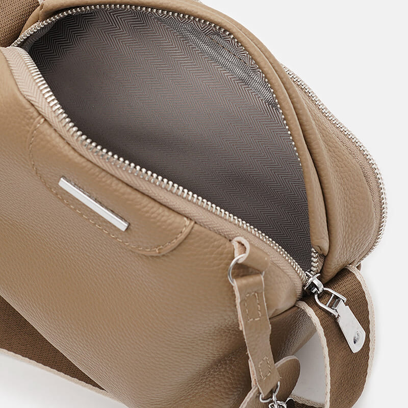 Женская кожаная сумка имеет 2 основных отделения на молнии, с внешней стороны – 1 карман на молнии, внутри сумки – 2 кармана для телефона и других мелочей. Текстиль подкладки. Несъемный текстильный ремень регулируется по длине.