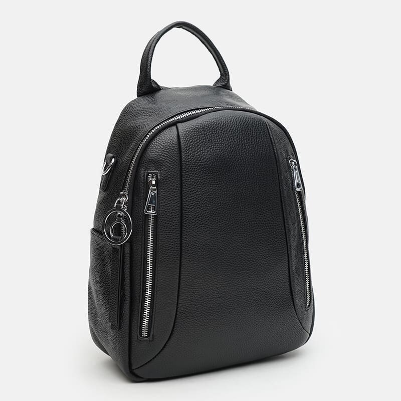 Женский кожаный рюкзак выполнен из натуральной кожи, Имеет 1 отделение на молнии. Внутри 4 кармана для телефона и других вещей. Снаружи 3 кармана на молнии и 2 боковых кармана. Подкладка текстиль. Цвет фурнитуры серебро. Фурнитура-металл. Рюкзак можно носить как сумку, пристегнув дополнительный текстильный ремень. Плечевые ремни регулируются по длине.