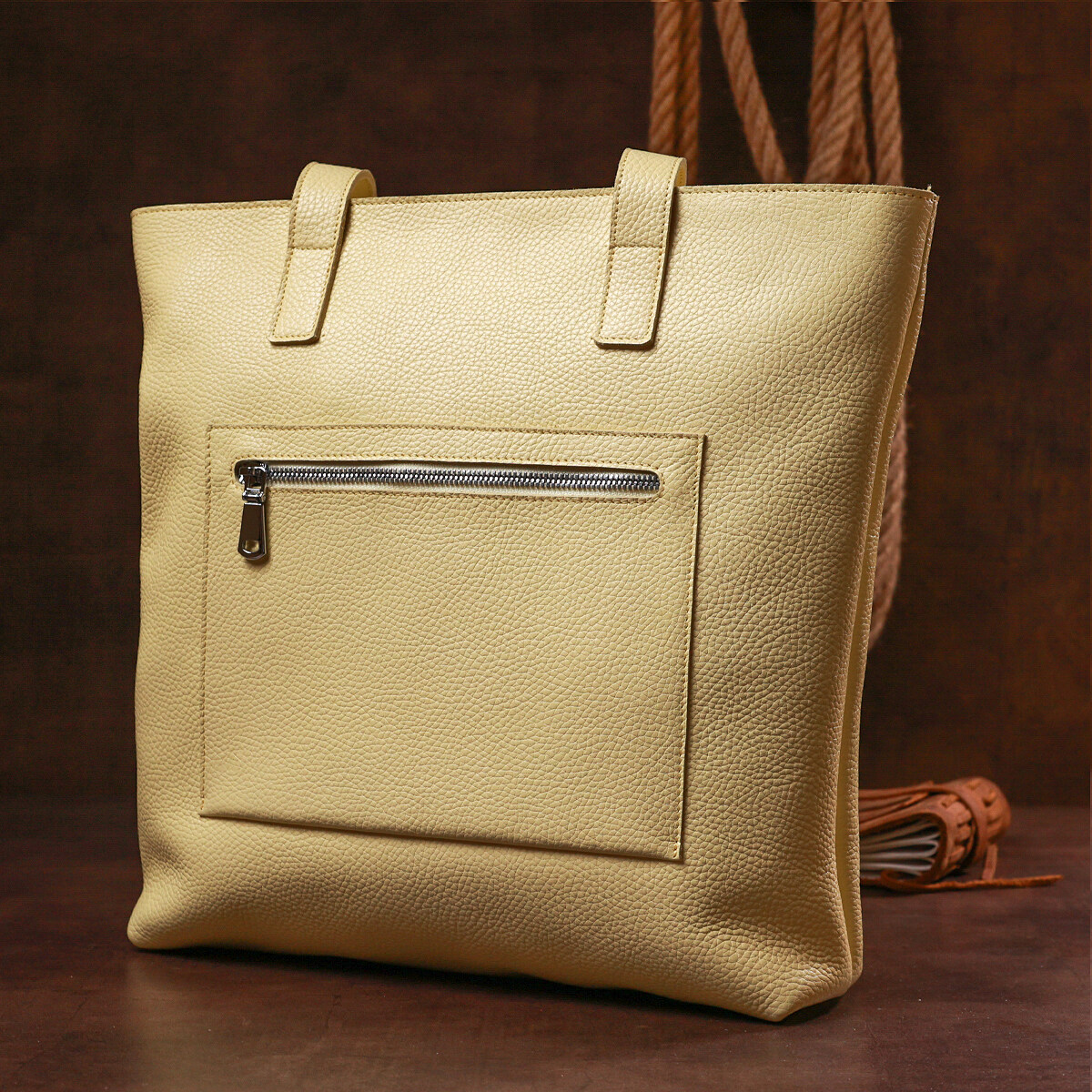 Стильная женская сумка в изумительном лимонном цвете, что смотрится по-летнему свежо и красиво. Материал изготовления – натуральная кожа высокого качества с повышенными показателями устойчивости к износу. Внутреннее наполнение представлено в виде просторного основного отделения с внутренним небольшим карманом. На внешней стороне также есть кармашек на молнии.