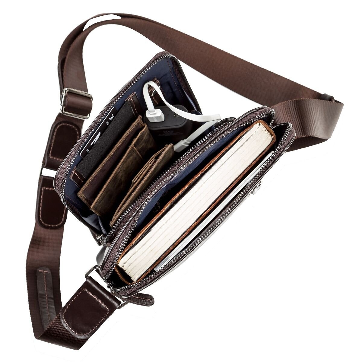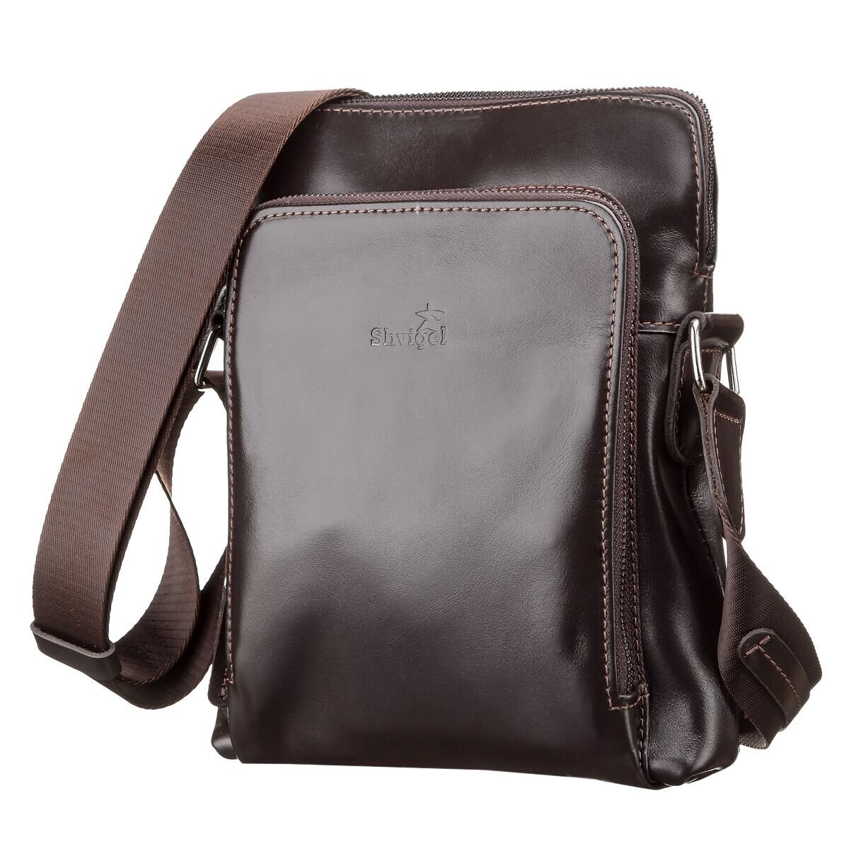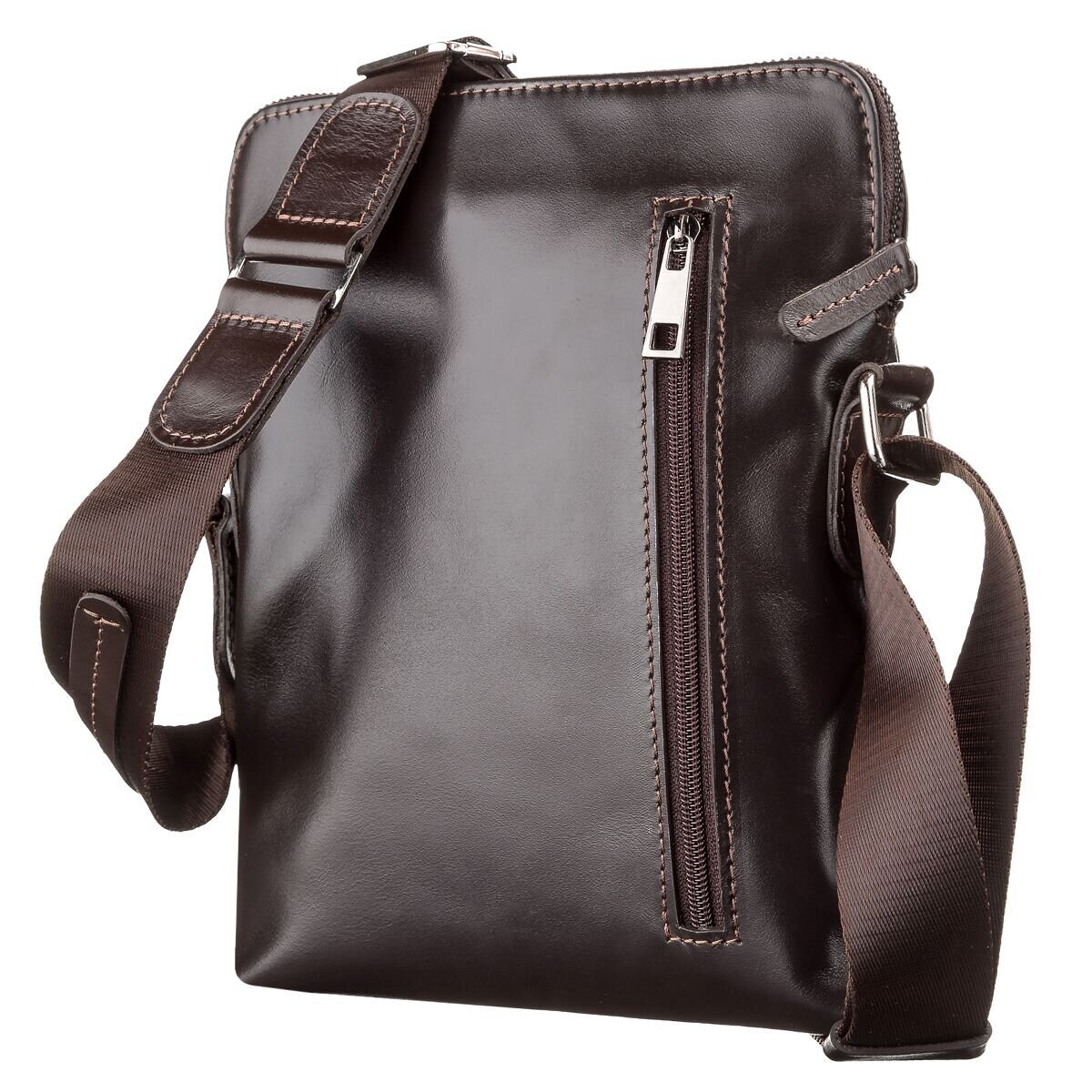 Коричневая мужская сумка, из натуральной гладкой кожи, небольшого размера. Очень функциональная и удобная. Особенность дизайна позволит мужчине носить с собой много нужных мелочей.