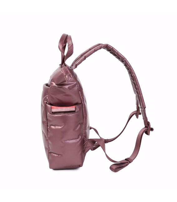 Вместительный, дутый рюкзак-идеальный спутник на каждый день. Оснащен большим основным отделением с внутренними карманами и съёмной косметичкой. С внешней стороны расположен карман на молнии, также есть боковые карманы для зонтика или бутылки с карабином для ключей. Выполнен из плотного 100% polyester.