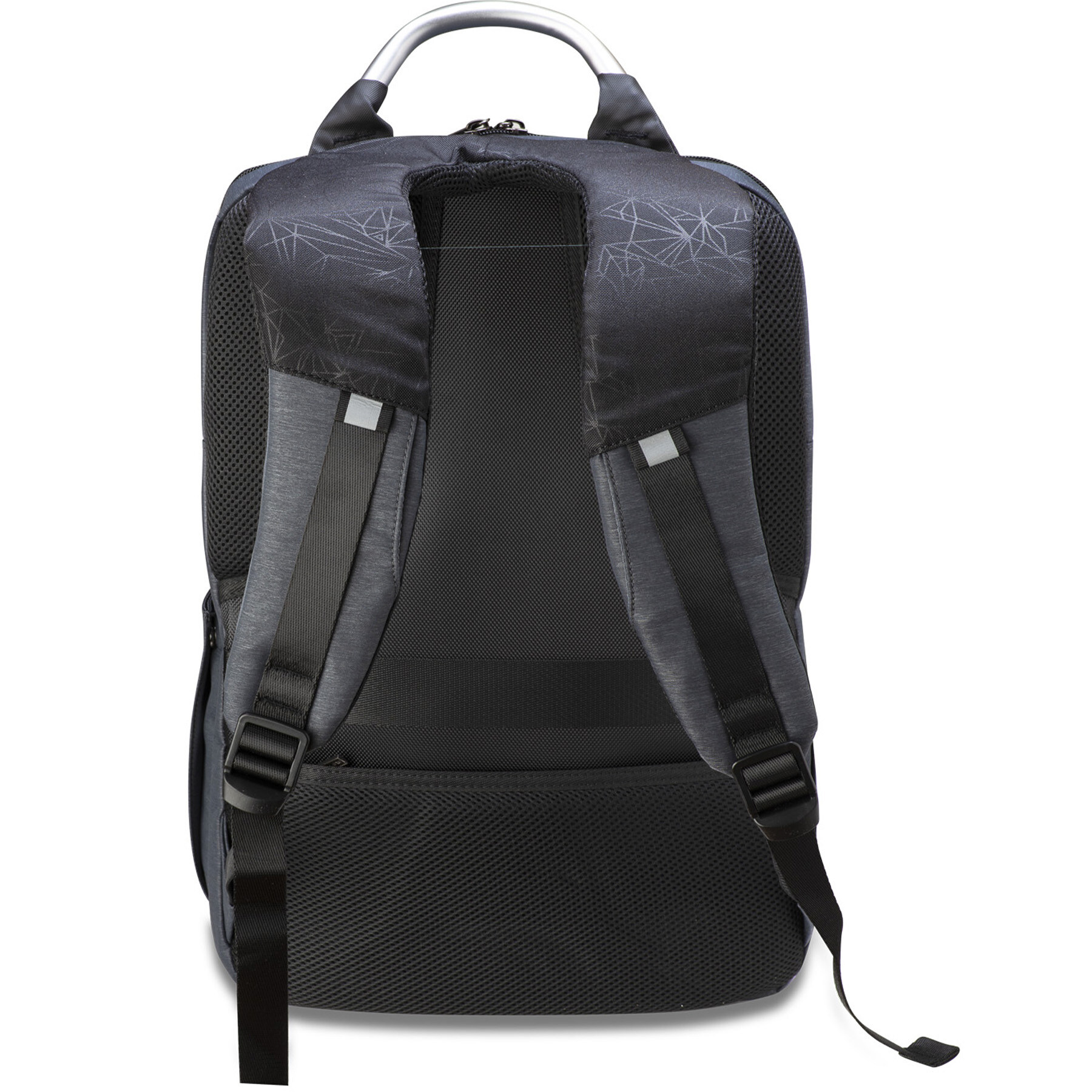 Основное отделение вмещает ноутбук диагональю до 15.6 дюймов, а также имеет отдельную секцию для планшета и органайзеры для аксессуаров. Передний отдел предназначен для документов формата A4 и оснащен двумя внутренними карманами с подкладкой. По бокам - два кармана на кнопках, а на спинке - потайной карман на молнии. Нижняя часть оснащена резиновыми ножками для лучшей устойчивости и защиты дна. Верхняя металлическая ручка добавляет элегантности и удобства в переноске. Задняя часть имеет специальную ленту для крепления рюкзака к чемодану.