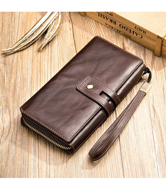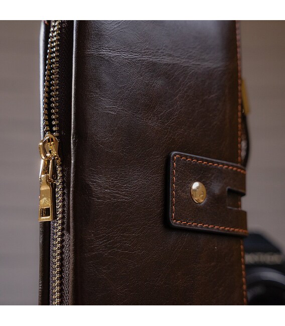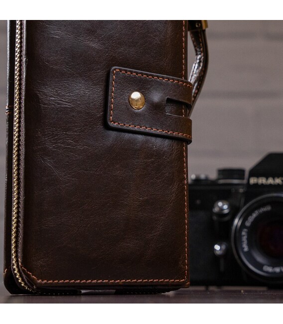 Очень функциональный клатч из натуральной кожи. Изделие обладает внушительным функционалом. Особенностью данной модели будет то, что в ней доступны две кнопки с помощью которых вы можете регулировать наполненность клатча. Модель идеально сочетает в себе функционал портмоне и кредитницы. Если вы очень часто носите большое количество визиток и хотите держать их всегда под рукой – рекомендуем вам данный клатч. Вы также можете носить изделие на запястье с помощью соответствующего ремешка.