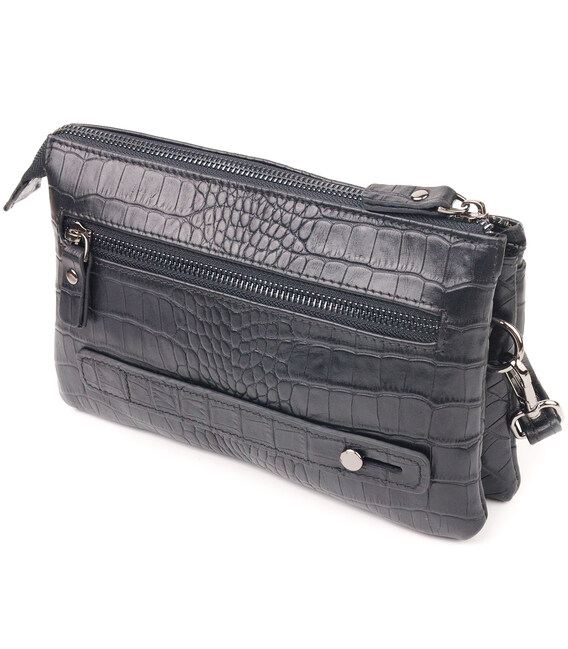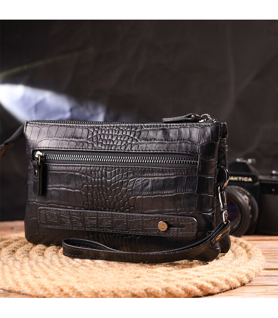Надежный клатч для мужчин, из натуральной качественной кожи, с тиснением под крокодила. Аксессуар имеет одно основное отделение, внутри которого два кармана на молниях и две ячейки для кредитных карт. Снаружи в изделии расположены два кармана на лицевой и тыльной стороне, что закрываются на молнию. Внизу аксессуара есть ремешок для носки на руке, что очень удобно в использовании, также есть съемный кистевой ремень. Чем удобен клатч - в него Вы можете положить все самое необходимое и все будет под рукой.