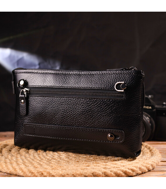 Современный клатч для мужчин, из натуральной кожи флотар. Аксессуар имеет одно основное отделение, внутри которого два боковых кармана, открытого и закритого типа. Снаружи в изделии расположены два кармана, один под клапаном на лицевой стороне, другой на молнии, на тыльной стороне. Внизу аксессуара есть ремешок для носки на руке, что очень удобно в использовании, также есть съемный кистевой ремень и съемный плечевой ремень. Чем удобен клатч - в него Вы можете положить все самое необходимое и все будет под рукой.