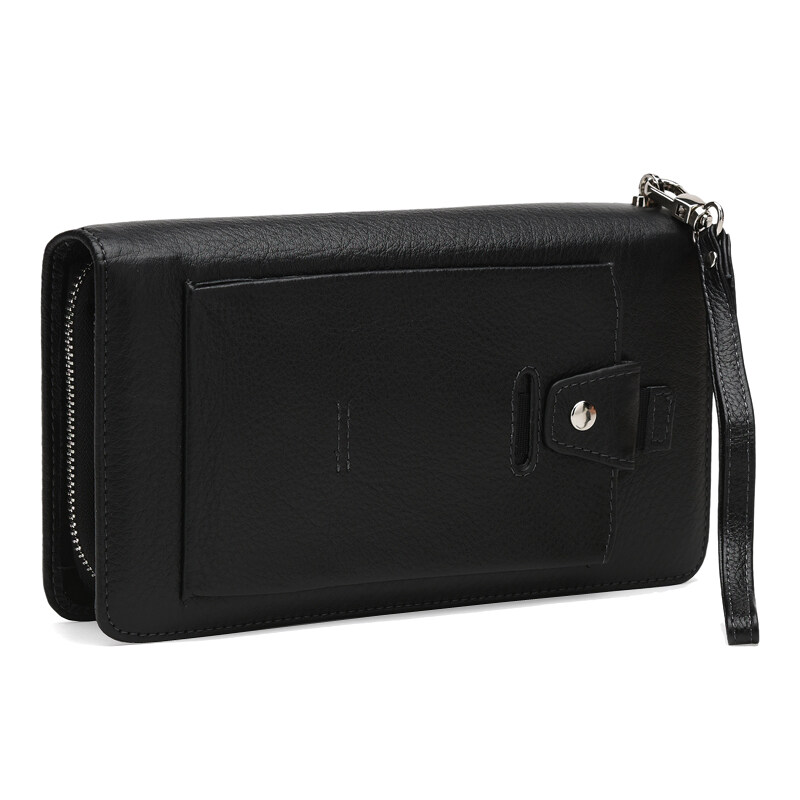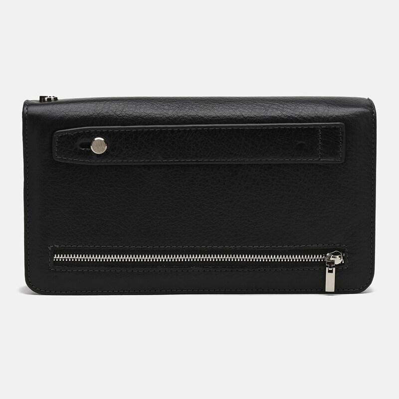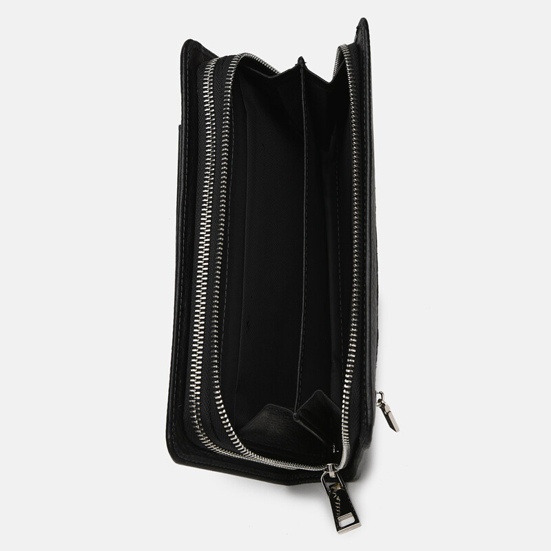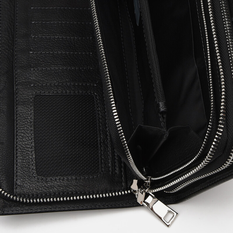 Клатч имеет 2 отделения на молниях. Снаружи 1 карман на молнии и карман под телефон. Внутри-10 карманов под карточки, 4 отделения под купюры,1 монетница и несколько дополнительных карманов под нужные мелочи. Подкладка- текстиль. В комплекте есть съемный ремешек на руку.