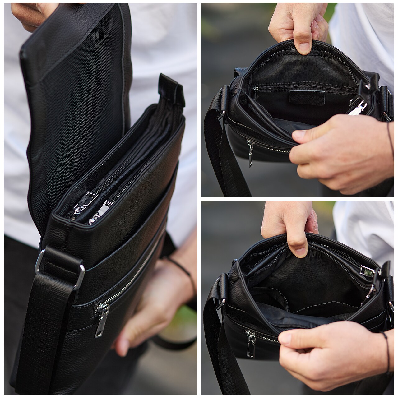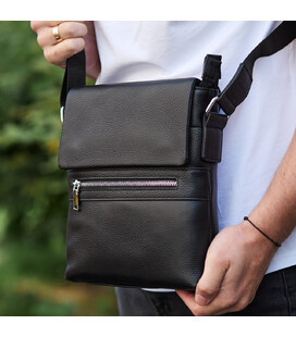 Мужская кожаная сумка через плечо (мессенджер) является очень нужным и практичным аксессуаром для современного мужчины. Эта сумка стильно выглядит, качественно сделана и гармонично подойдет к любому стилю, а благодаря своей форме удобна в использовании. Сумка закрывается на перекидной клапан, под которым находится два основных отделения, закрывающиеся на молнии. Внутри сумки дополнительно есть боковой карман на молнии и два открытых кармана для мелочей. Снаружи под клапаном размещен глубокий открытый карман, а с тыльной стороны - врезной карман на молнии. Подкладка сумки - текстиль. Цвет фурнитуры - серебро. Имеет текстильный регулируемый ремень.