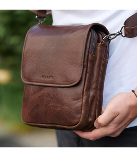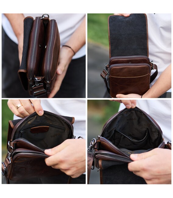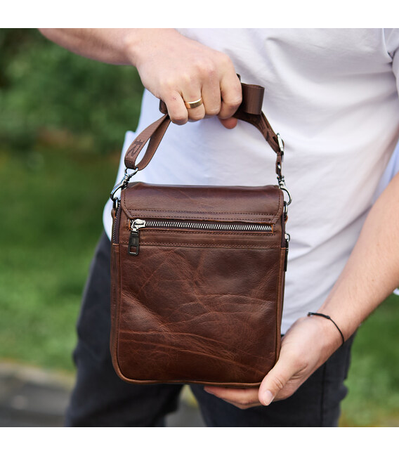 Вместительная мужская сумка через плечо, выполнена из мягкой на ощупь высококачественной натуральной кожи. Два основных отделения равномерны, одно из них имеет потайной карман на молнии, а также карман открытого типа. Между основными отделениями находится дополнительное отделение на магнитной кнопке. С тыльной части сумки находится карман на молнии, а с лицевой части – глубокое отделение без застежки, под накидкой. Отделения застегиваются при помощи качественной фурнитуры. Внутренняя отделка сумки являет собой плотную подкладку. Ремень сумки текстильный, съёмный, надежно крепится при помощи карабина к кольцам по бокам сумки.