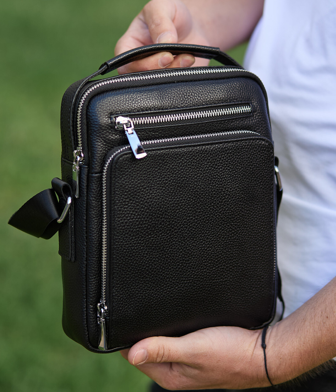 Мужской мессенджер Tiding Bag изготовлен из натуральной телячьей кожи. Аристократичный черный цвет подчеркивает статусность владельца. Лаконичный дизайн позволяет использовать аксессуар с повседневной и деловой одеждой. Для ношения можно использовать короткую ручку или плечевой ремень, регулируемый по длине. На сумку установлена надежная металлическая фурнитура.