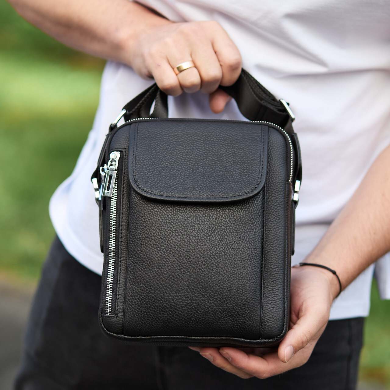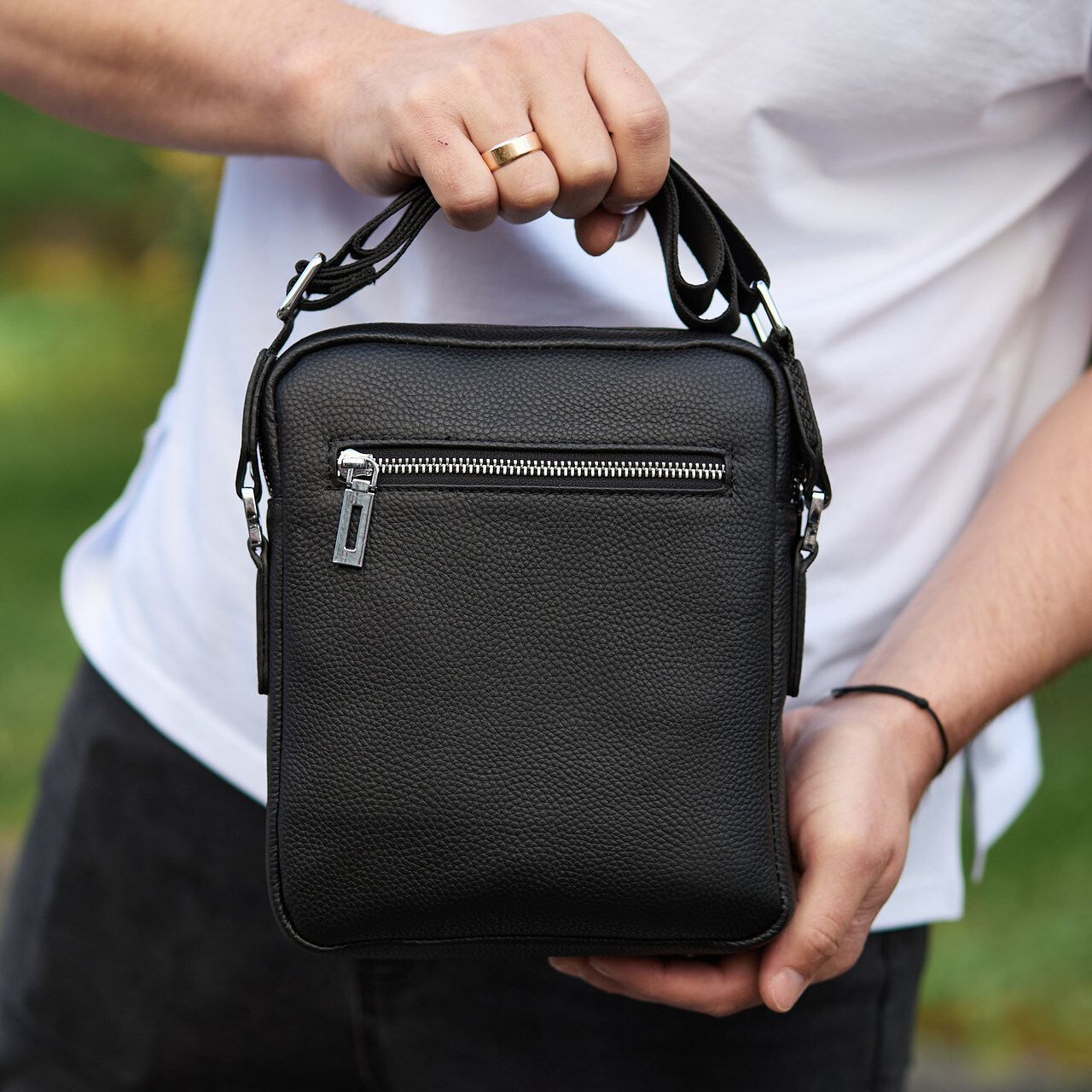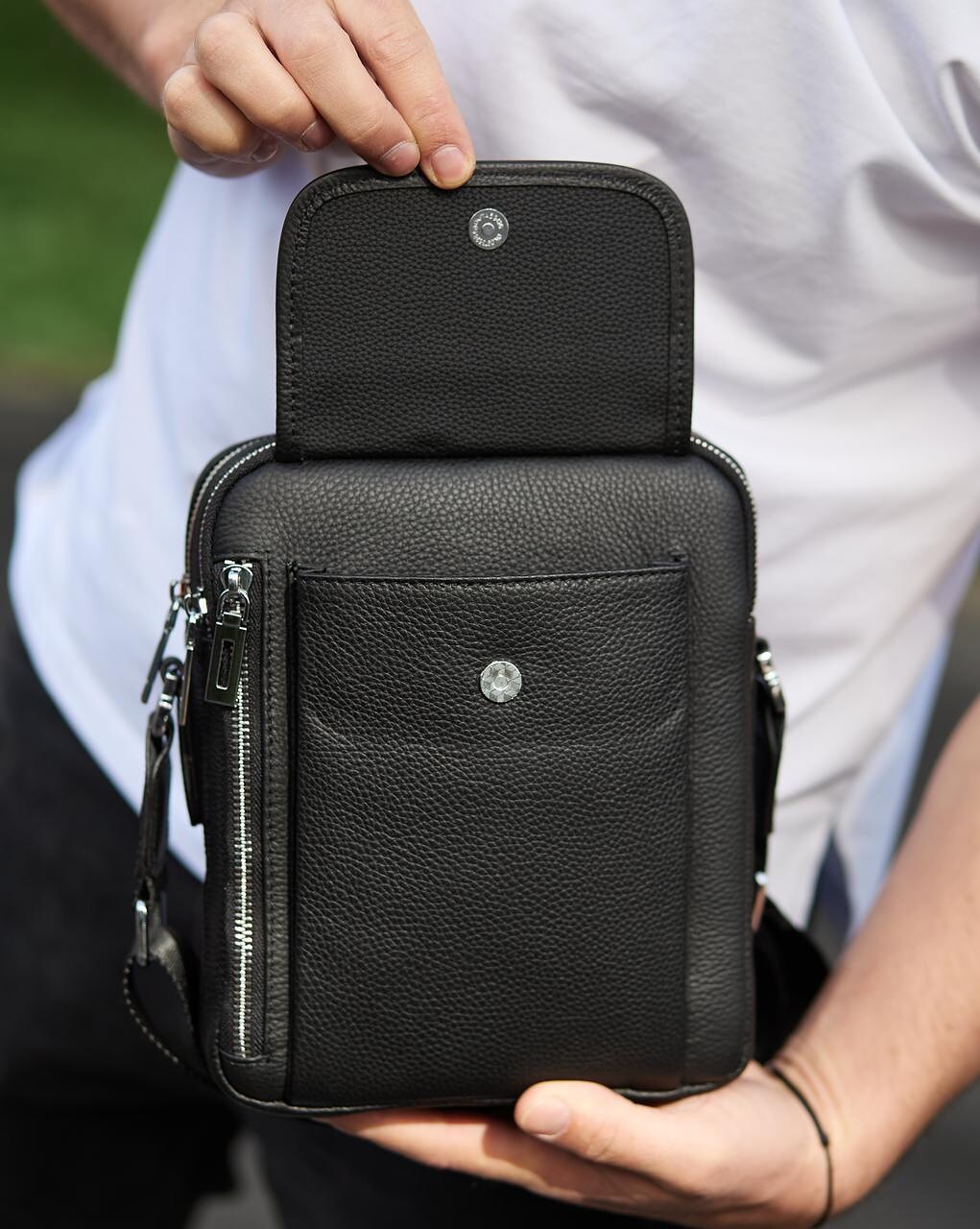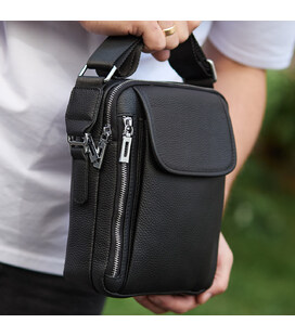 Лаконичная мужская сумка на плечо выполнена из высококачественной натуральной кожи, мягкой на ощупь. Изделие имеет два равномерных основных отделения, внутри которых находятся боковой карман на молнии, а также карман открытого типа. Кроме основных отделений, сумка имеет снаружи также три дополнительных отделения-карманы (с лицевой и тыльной части). Каждое отделение застегивается при помощи качественной фурнитуры. Внутри сумка отделана плотной подкладкой. Ремешок сумки плотный, регулируемый, съёмный, а короткая ручка удобная в руке.