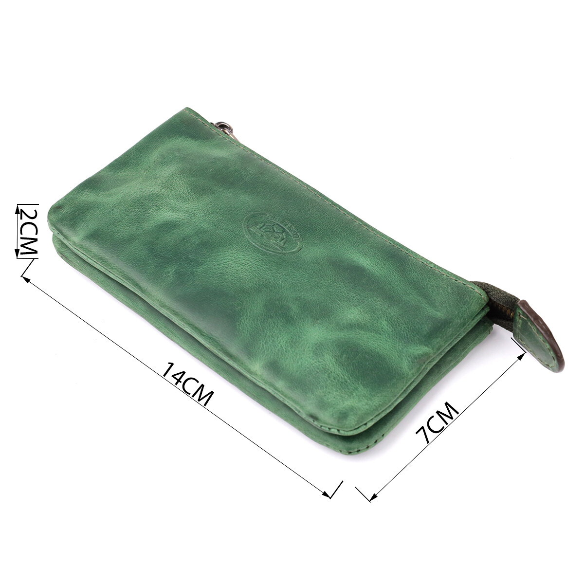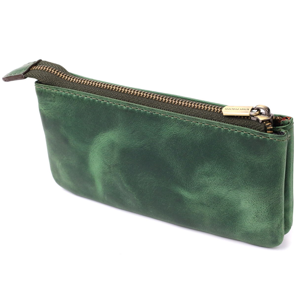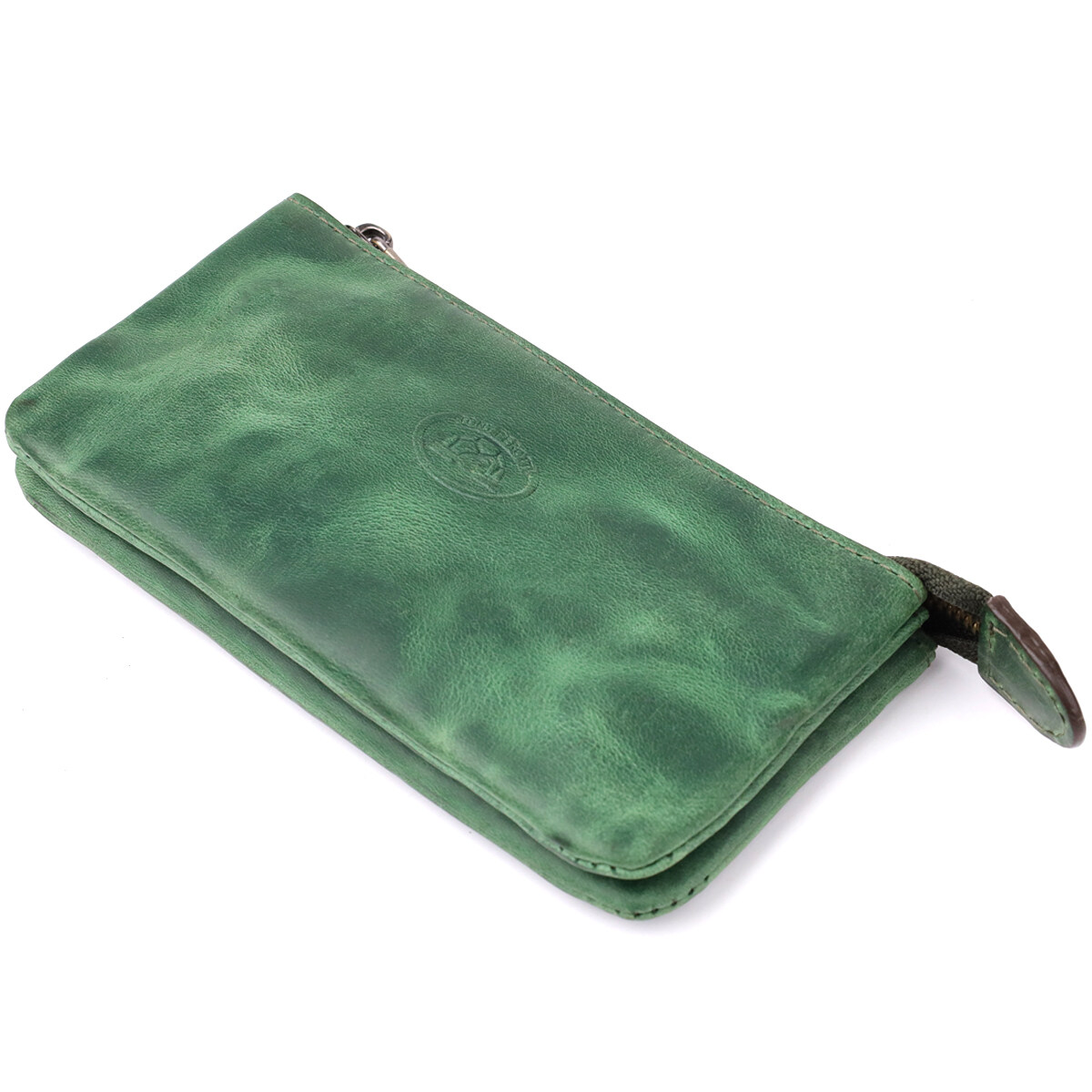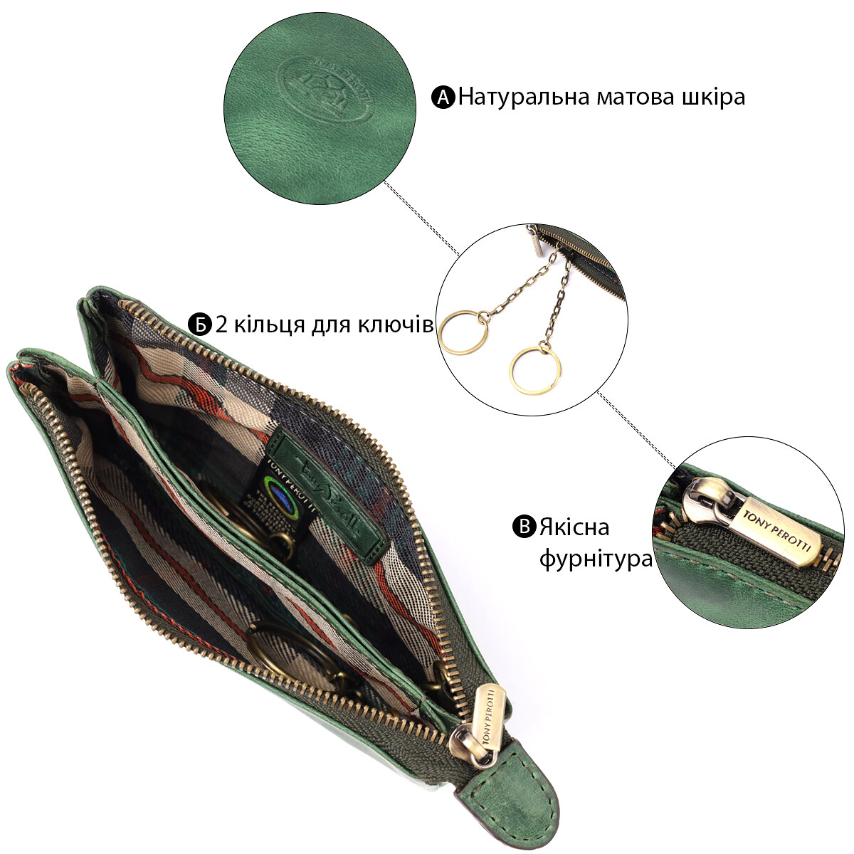 Ключница из натуральной винтажной кожи в зеленом цвете. Закрывается на молнию – удобно и надежно. Оснащена тремя отделениями и двумя кольцами для ключей. Дополнена брендированной фурнитурой высокого качества. Такая ключница объединяет функциональность и элегантность. Подойдет для ежедневного использования и станет достойным аксессуаром или подарком..