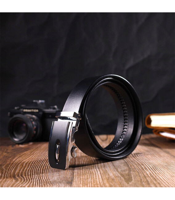 Мужской кожаный ремень под брюки из натуральной качественной кожи. Ремень изготовлен из цельного полотна кожи, имеет гладкую фактуру, длина регулируется в меньшую сторону. Дополнен ремень надежной пряжкой-автомат, с серебристыми вставками. Кожаный ремень один из самых удачных и нужных подарков для близкого человека.