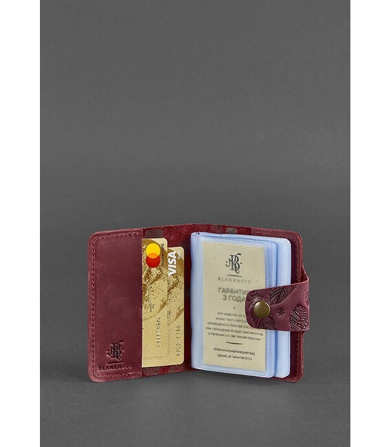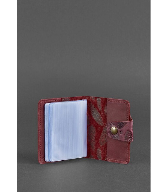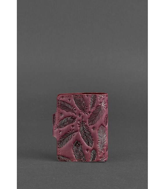 Женский кожаный кард-кейс 7.1 (Книжечка) бордовый с перьями Crazy Horse