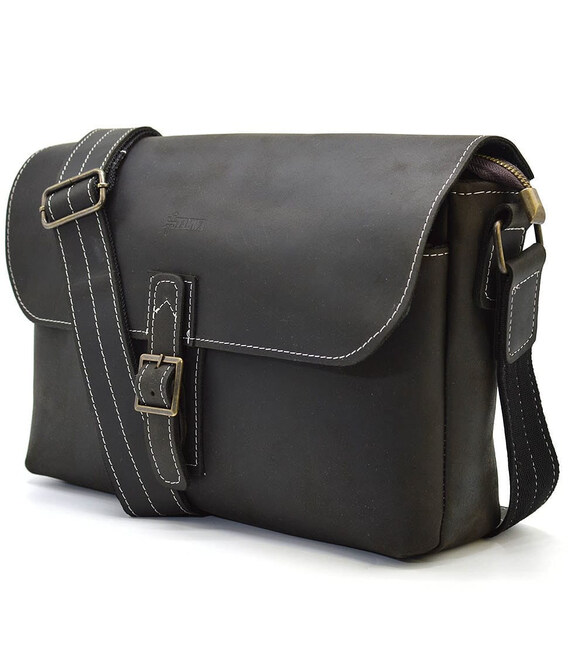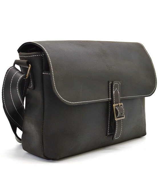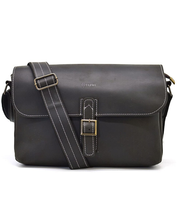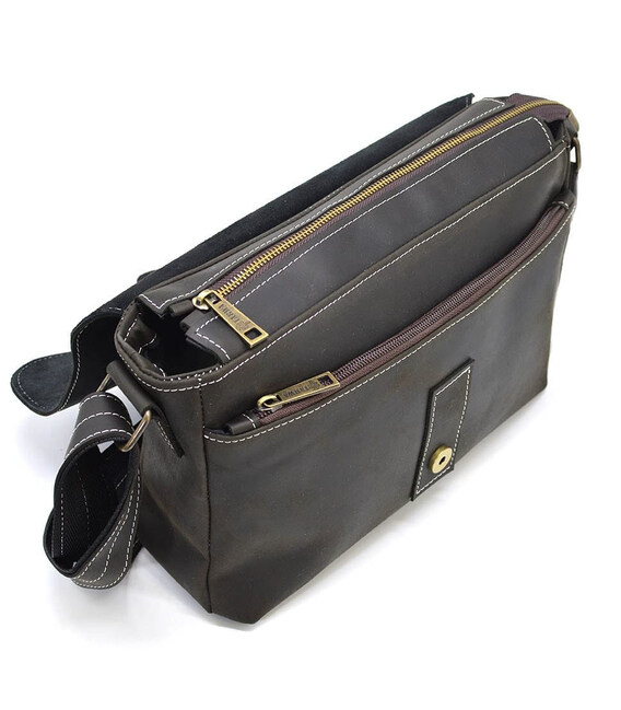 Месенджер зі шкіри крейзі хорс, сумка наплічна TARWA, RC-7084-3md. Стильна сумка месенджер унісекс від бренду TARWA. Якісна натуральна кінська шкіра крейзі хорс. Захоплюючий дизайн у темно-коричневому виконанні. Чудово підходить для щоденного використання. Зовнішня частина месенждера закривається на шкіряний клапан металевому замку. На задній частині сумки відділення на блискавці під невеликим клапаном. Шкіряний ремінь на плечі, який регулюється. Красива фурнітура, колір – бронза.