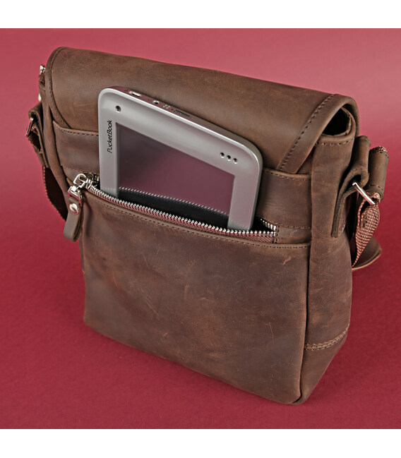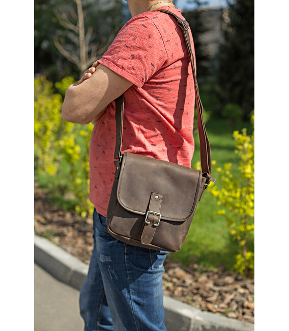 Современная мужская сумка через плечо. Аксессуар выполнен из натуральной высококачественной винтажной кожи. Цвет фурнитуры: серебро. Сумка надежно прошита прочной нитью. Швы - ровные, аккуратные.