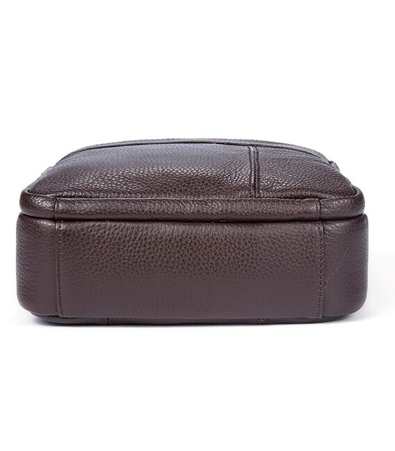Хорошая компактная сумка из натуральной кожи высокого качества. По краям аксессуар прошит коричневой нитью. Модель дополнена фурнитурой цвета темного металла. Оптимальный вариант для тех, кто любит маленькие компактные сумочки и предпочитает, чтоб все было под рукой. Будет идеальным подарком для стильного и солидного мужчины.