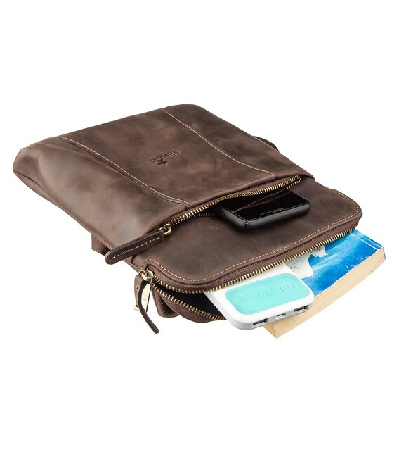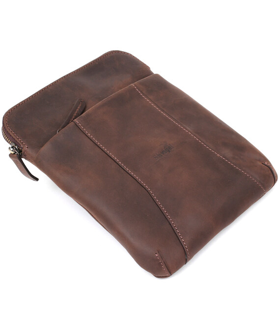 Модель сумки отлично подойдет для тех, кто ищет сумку компактного размера. Аксессуар прошит по краям коричневой строчкой. Выполнена из винтажной кожи, которая солидно и эффектно смотрится даже со временем эксплуатации. В комплекте сумки идет оранжевый тканевый чехол, что делает ее прекрасным вариантом для подарка.