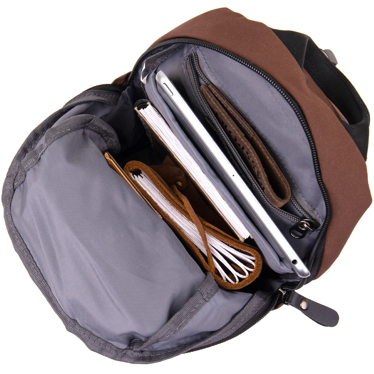 Модель имеет два основных отделения на молниях, что позволяет удобно распределить содержимое. Внутри предусмотрены два кармашка для мобильного телефона и потайной карман на молнии. На лицевой стороне под клапаном расположен открытый карман, накладная петелька под механической застежкой и встроенный карман на молнии. На тыльной стороне сумки также предусмотрен карман на молнии для вещей, которые должны быть под рукой.