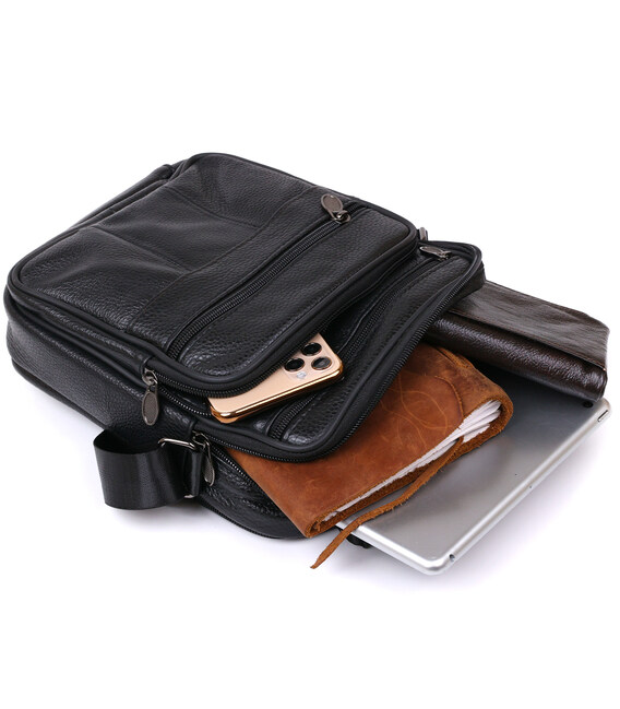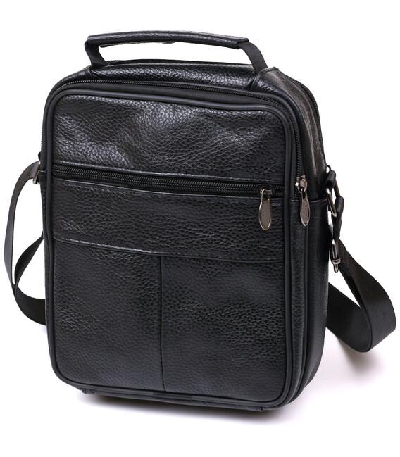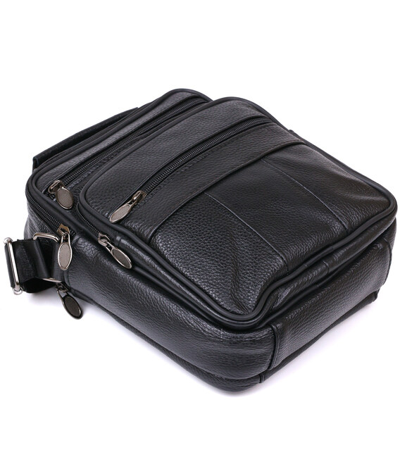 Небольшой мужской мессенджер из высококачественной натуральной кожи, которая устойчива к различным повреждениям и износу. Имеет два вместительных отделения и четыре дополнительных кармана для различных аксессуаров. Ремень выполнен из прочного текстиля и регулируется по длине. Цвет изделия – универсальный черный, что очень практично и удобно.