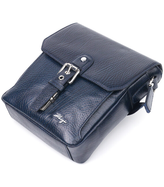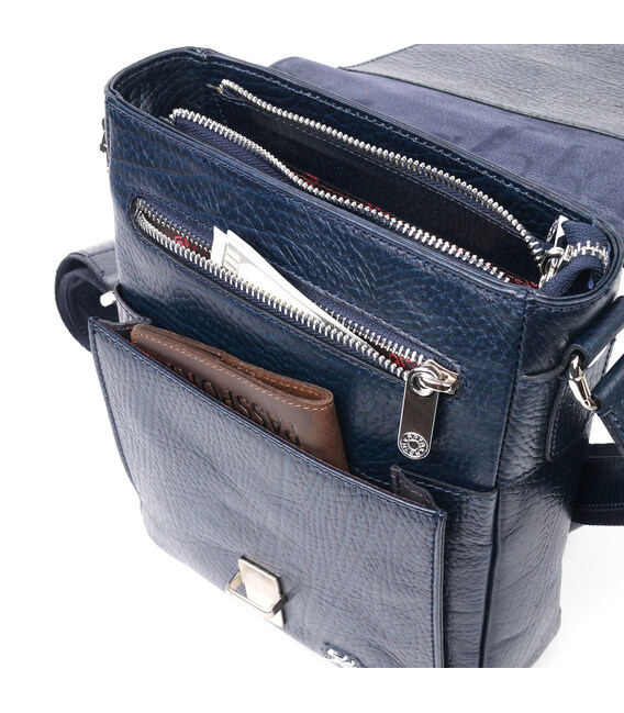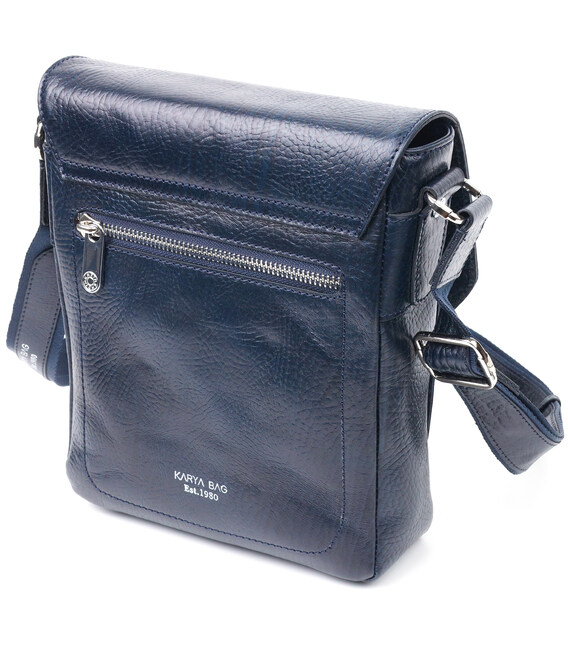 Мужская сумка синего цвета из натуральной зернистой кожи высокого качества. Аксессуар имеет надежную фурнитуру серебристого цвета и прочную подкладку. Изделие упаковано в фирменный текстильный мешок Karya. Качественная мужская сумка из натуральной кожи, всегда была отличным подарком для мужчины любого возраста.