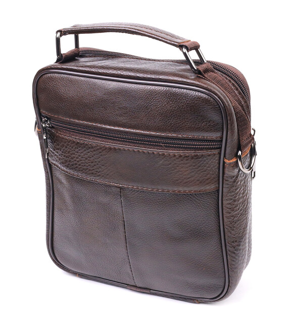 Коричневая мужская сумка среднего размера из натуральной кожи. Модель идеально подойдет на каждый день. В сумку с легкостью поместятся все самые необходимые вещи. С такой сумкой будет удобно ходить на работу или встречи. Дополнено изделие качественной фурнитурой, цвета темное серебро. Сумка станет прекрасным подарком для близкого человека.