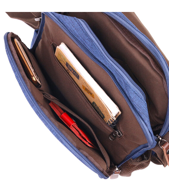 Описание Интересная мужская сумка через плечо из текстиля 21264 Vintage Синяя