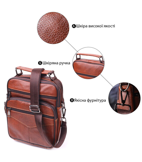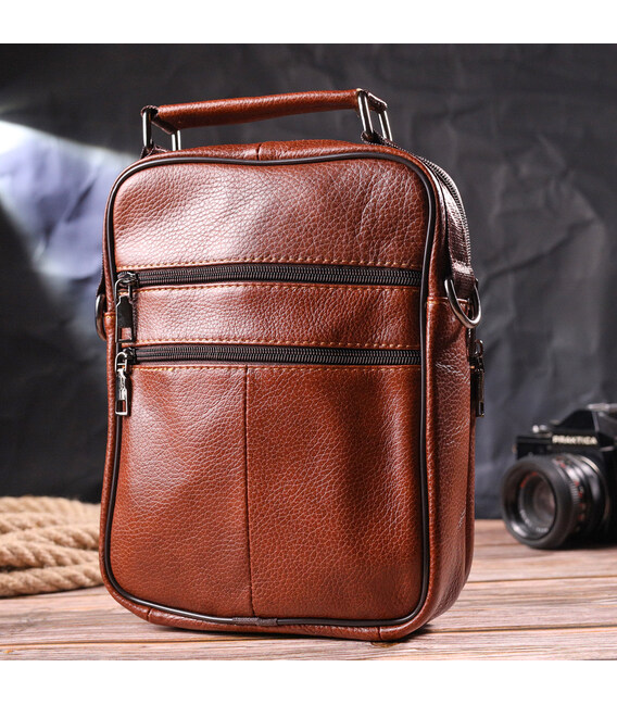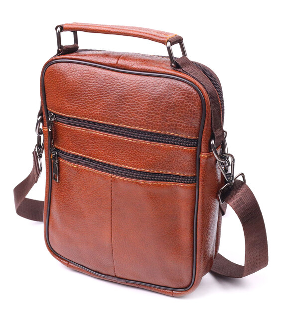 Удобная мужская сумка среднего размера из натуральной кожи. Модель которая идеально подойдет на каждый день. В аксессуаре одно основное отделение и шесть карманов разных размеров, сумку можна носить как в руке, так и на плече. В сумку с легкостью поместятся все самые необходимые вещи. С таким аксессуаром все Ваши вещи будут в порядке, с ним также будет удобно ходить на работу или встречи. Дополнено изделие качественной фурнитурой, цвета темное серебро. Сумка станет прекрасным подарком для близкого человека.