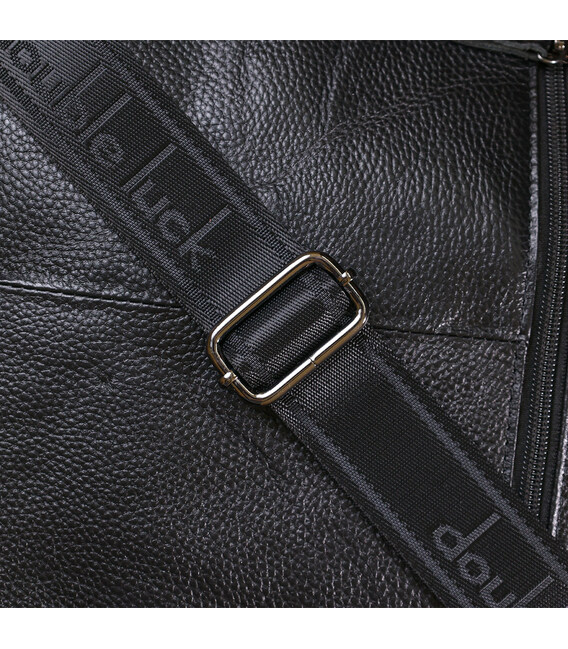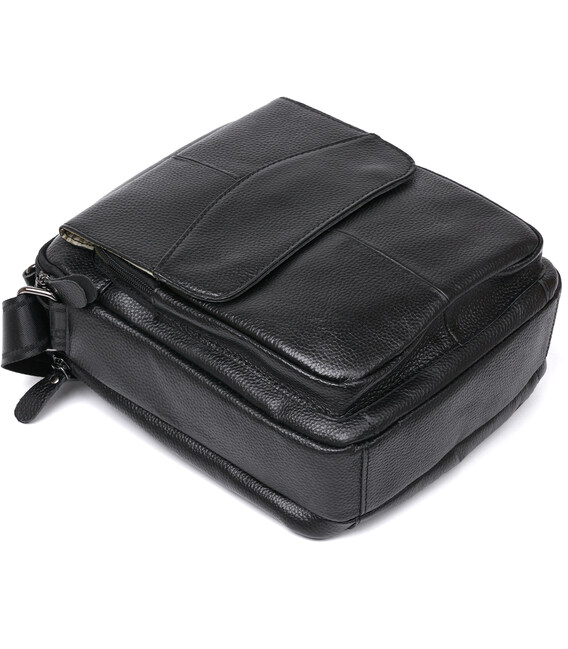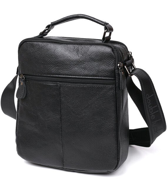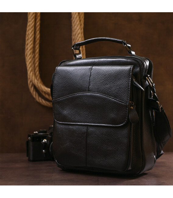 Вместительная мужская сумка стандартного размера из натуральной высокопрочной кожи. Имеет универсальный черный цвет и зернистую фактуру. Данная модель отлично подойдет тем, кому важно разместить все содержимое по отдельным карманам и отделениям. Сумку можно носить как в руке, так и через плечо. Ремень несъёмный, но регулируется по длине.